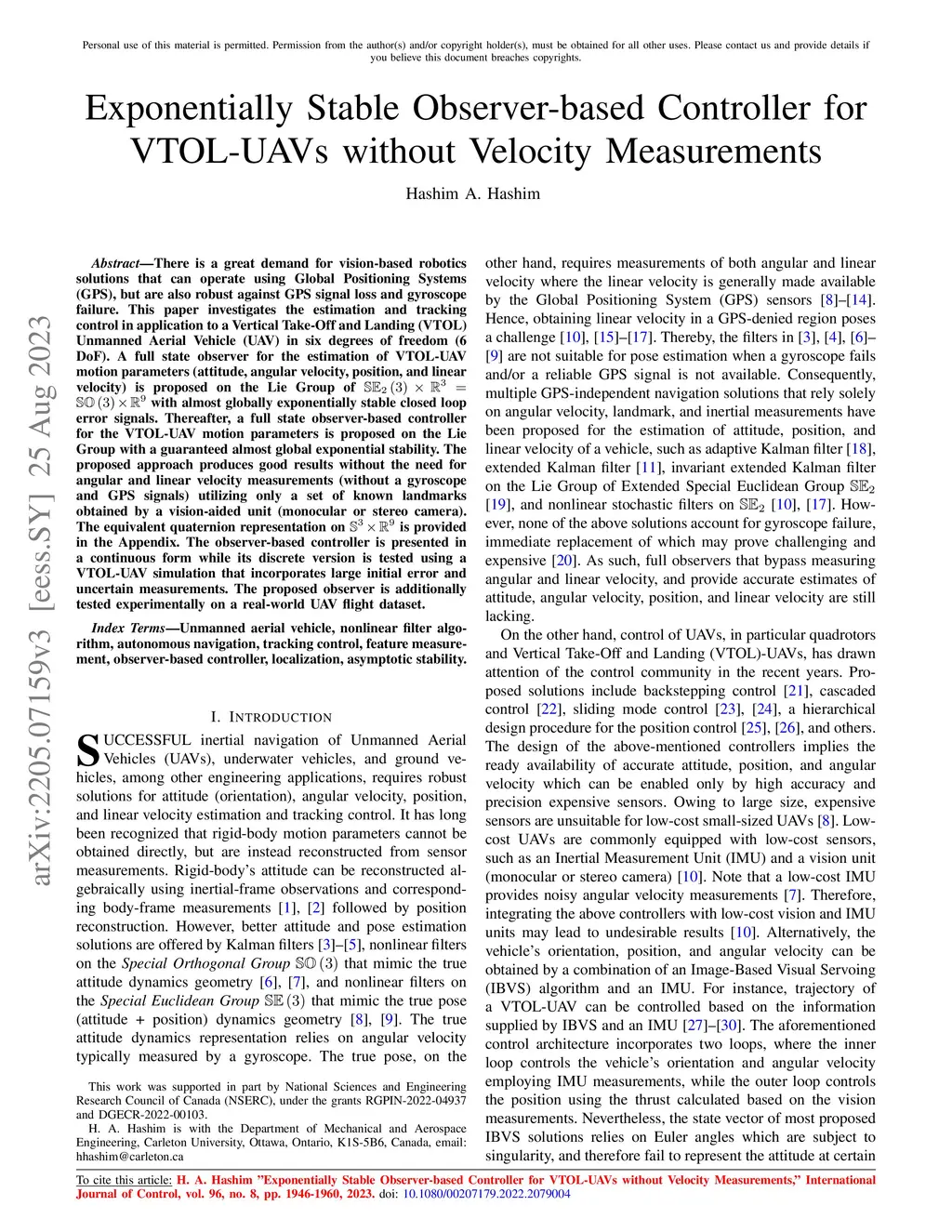 Exponentially Stable Observer-based Controller for VTOL-UAVs without