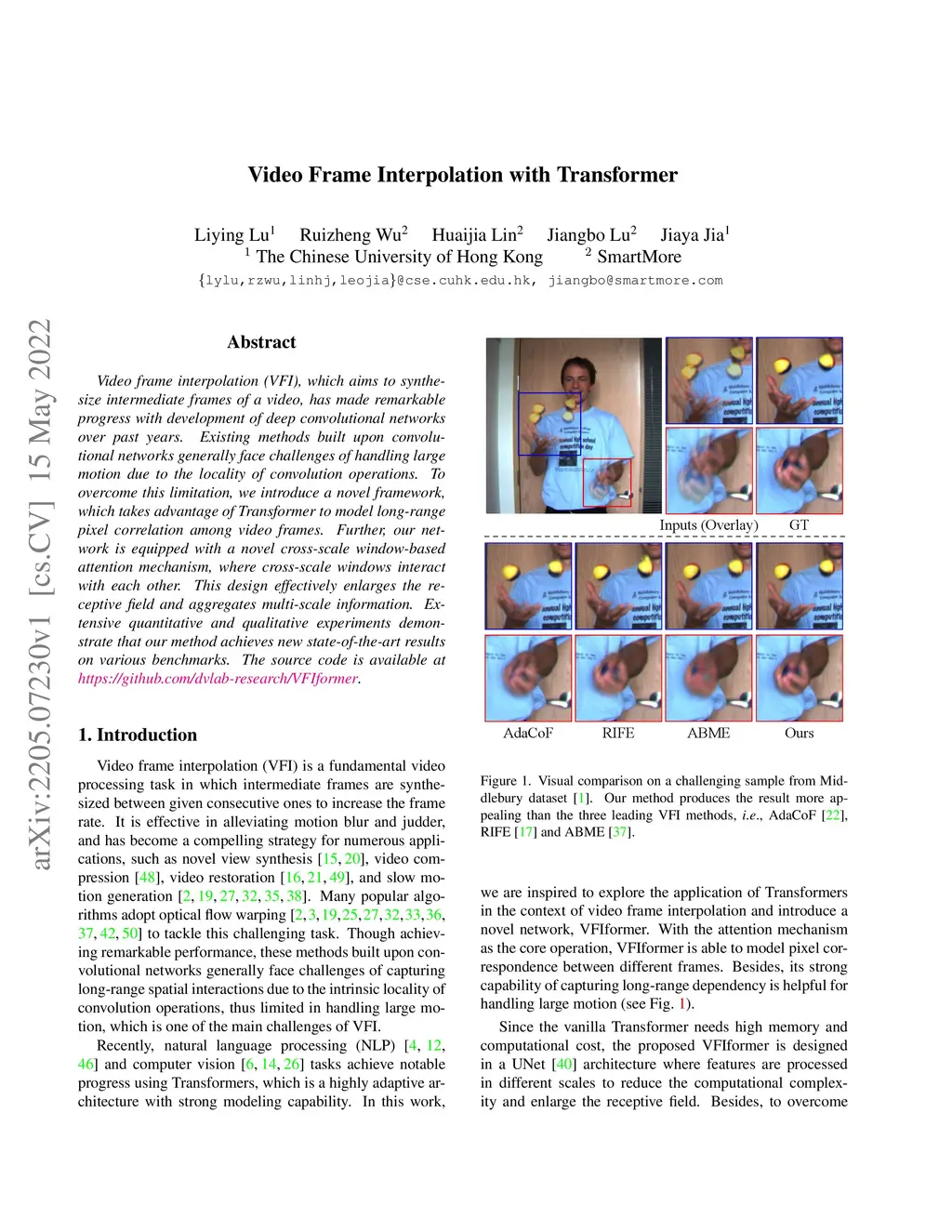 Video frame interpolation (VFI), which aims to synthesize intermediate frames of a video, has made remarkable progress with development of deep convolutional networks over past years. Existing methods built upon convolutional networks generally face challenges of handling large motion due to the locality of convolution operations. To overcome this limitation, we introduce a novel framework, which takes advantage of Transformer to model long-range pixel correlation among video frames. Further, our network is equipped with a novel cross-scale window-based attention mechanism, where cross-scale windows interact with each other. This design effectively enlarges the receptive field and aggregates multi-scale information. Extensive quantitative and qualitative experiments demonstrate that our method achieves new state-of-the-art results on various benchmarks.