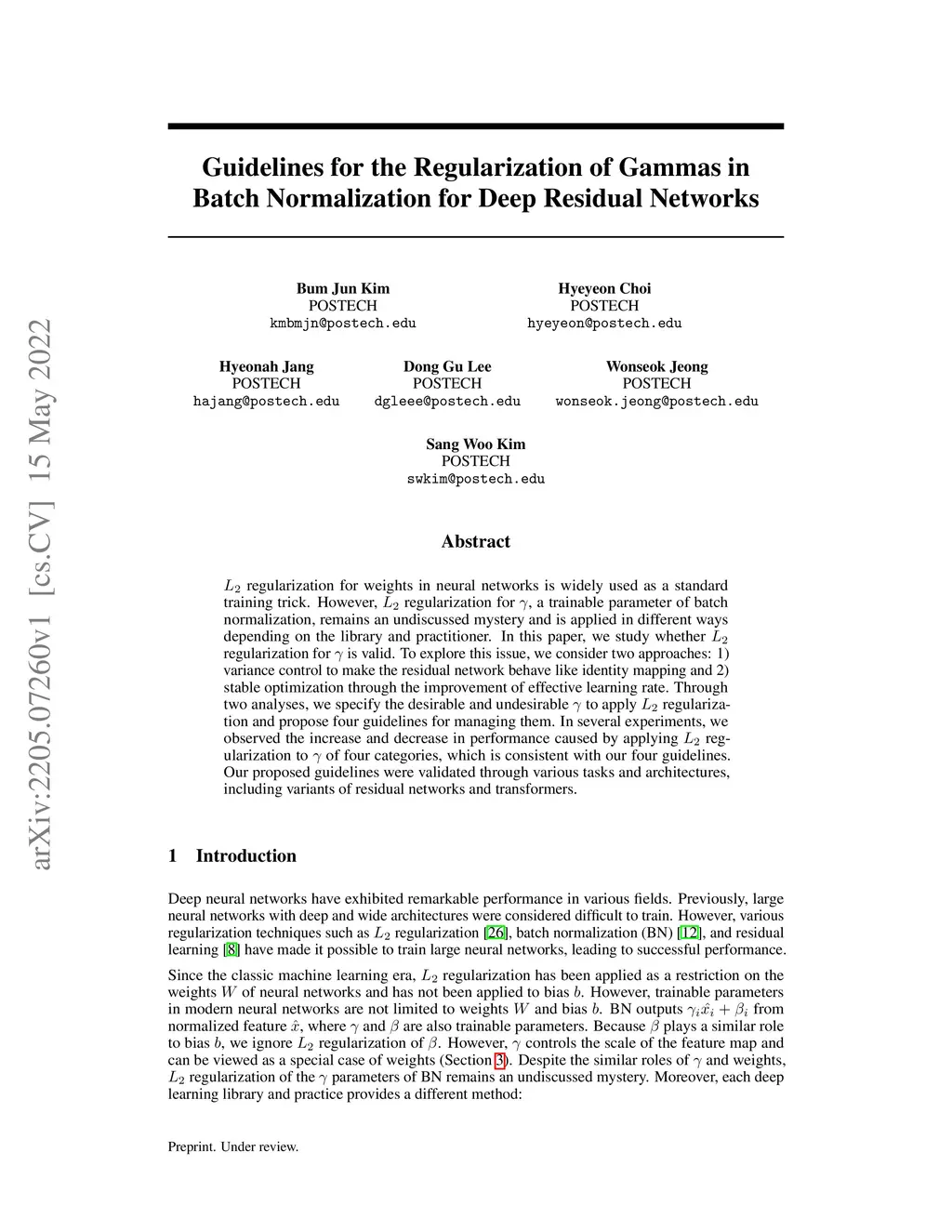 L2 regularization for weights in neural networks is widely used as a standard training trick. However, L2 regularization for gamma, a trainable parameter of batch normalization, remains an undiscussed mystery and is applied in different ways depending on the library and practitioner. In this paper, we study whether L2 regularization for gamma is valid. To explore this issue, we consider two approaches: 1) variance control to make the residual network behave like identity mapping and 2) stable optimization through the improvement of effective learning rate. Through two analyses, we specify the desirable and undesirable gamma to apply L2 regularization and propose four guidelines for managing them. In several experiments, we observed the increase and decrease in performance caused by applying L2 regularization to gamma of four categories, which is consistent with our four guidelines. Our proposed guidelines were validated through various tasks and architectures, including variants of residual networks and transformers.