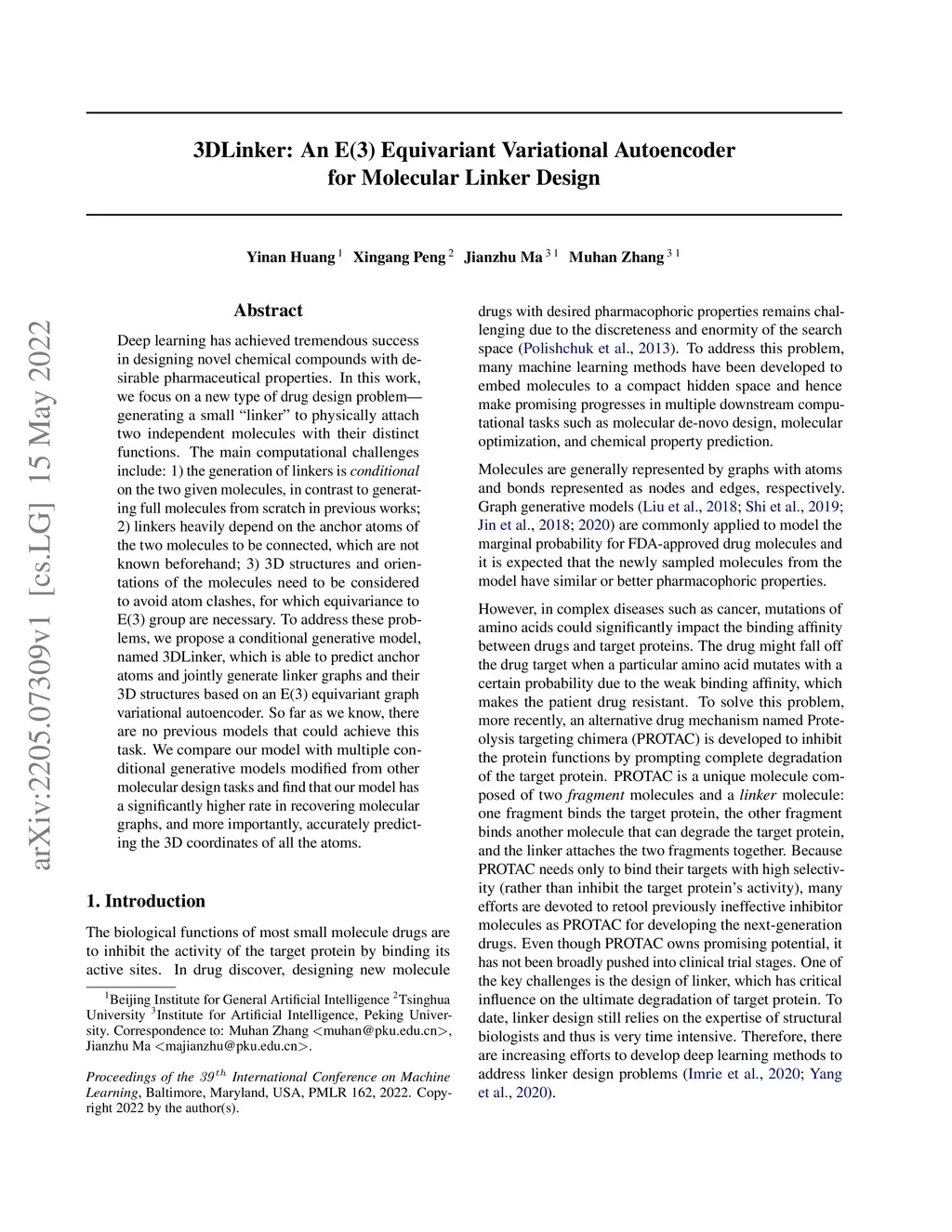 Deep learning has achieved tremendous success in designing novel chemical compounds with desirable pharmaceutical properties. In this work, we focus on a new type of drug design problem -- generating a small "linker" to physically attach two independent molecules with their distinct functions. The main computational challenges include: 1) the generation of linkers is conditional on the two given molecules, in contrast to generating full molecules from scratch in previous works; 2) linkers heavily depend on the anchor atoms of the two molecules to be connected, which are not known beforehand; 3) 3D structures and orientations of the molecules need to be considered to avoid atom clashes, for which equivariance to E(3) group are necessary. To address these problems, we propose a conditional generative model, named 3DLinker, which is able to predict anchor atoms and jointly generate linker graphs and their 3D structures based on an E(3) equivariant graph variational autoencoder. So far as we know, there are no previous models that could achieve this task. We compare our model with multiple conditional generative models modified from other molecular design tasks and find that our model has a significantly higher rate in recovering molecular graphs, and more importantly, accurately predicting the 3D coordinates of all the atoms.