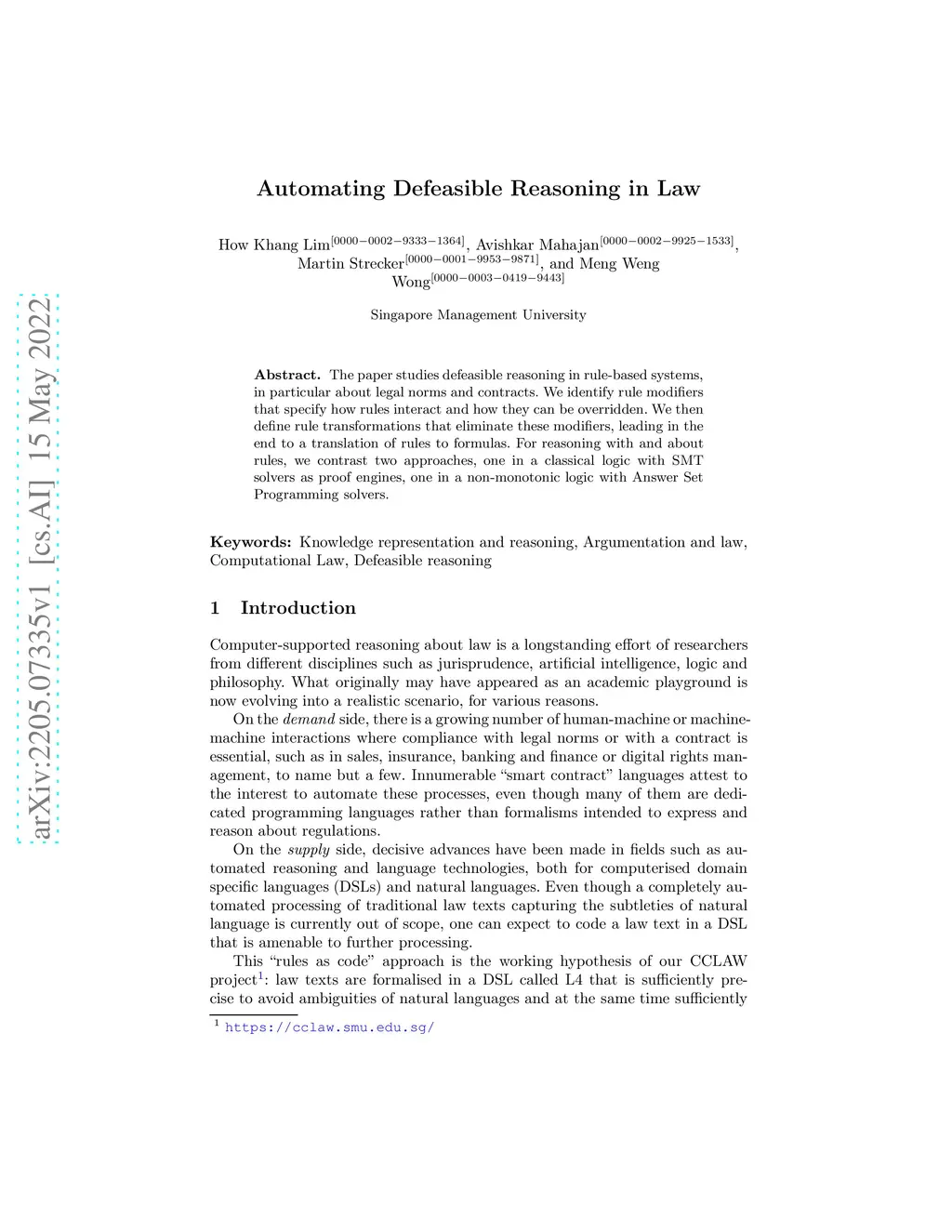 The paper studies defeasible reasoning in rule-based systems, in particular about legal norms and contracts. We identify rule modifiers that specify how rules interact and how they can be overridden. We then define rule transformations that eliminate these modifiers, leading in the end to a translation of rules to formulas. For reasoning with and about rules, we contrast two approaches, one in a classical logic with SMT solvers as proof engines, one in a non-monotonic logic with Answer Set Programming solvers.