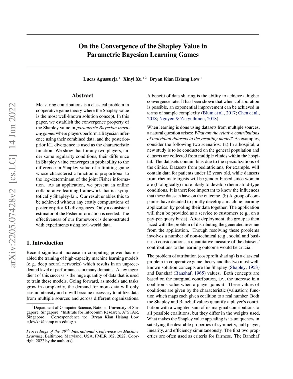 Measuring contributions is a classical problem in cooperative game theory where the Shapley value is the most well-known solution concept. In this paper, we establish the convergence property of the Shapley value in parametric Bayesian learning games where players perform a Bayesian inference using their combined data, and the posterior-prior KL divergence is used as the characteristic function. We show that for any two players, under some regularity conditions, their difference in Shapley value converges in probability to the difference in Shapley value of a limiting game whose characteristic function is proportional to the log-determinant of the joint Fisher information. As an application, we present an online collaborative learning framework that is asymptotically Shapley-fair. Our result enables this to be achieved without any costly computations of posterior-prior KL divergences. Only a consistent estimator of the Fisher information is needed. The effectiveness of our framework is demonstrated with experiments using real-world data.
