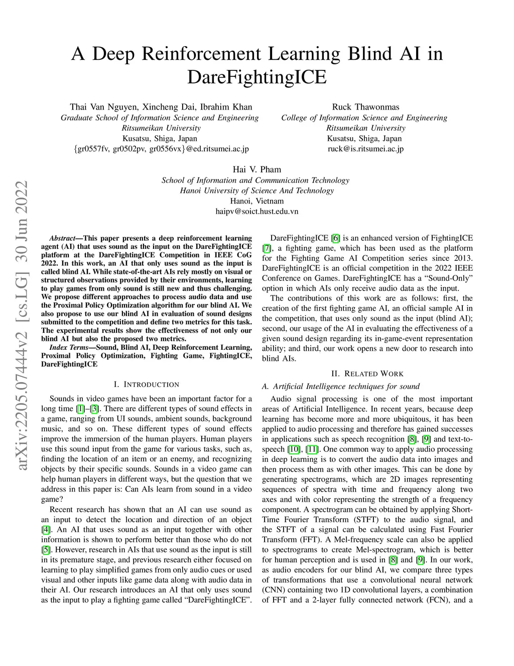 This paper presents a deep reinforcement learning agent (AI) that uses sound as the input on the DareFightingICE platform at the DareFightingICE Competition in IEEE CoG 2022. In this work, an AI that only uses sound as the input is called blind AI. While state-of-the-art AIs rely mostly on visual or structured observations provided by their environments, learning to play games from only sound is still new and thus challenging. We propose different approaches to process audio data and use the Proximal Policy Optimization algorithm for our blind AI. We also propose to use our blind AI in evaluation of sound designs submitted to the competition and define two metrics for this task. The experimental results show the effectiveness of not only our blind AI but also the proposed two metrics.