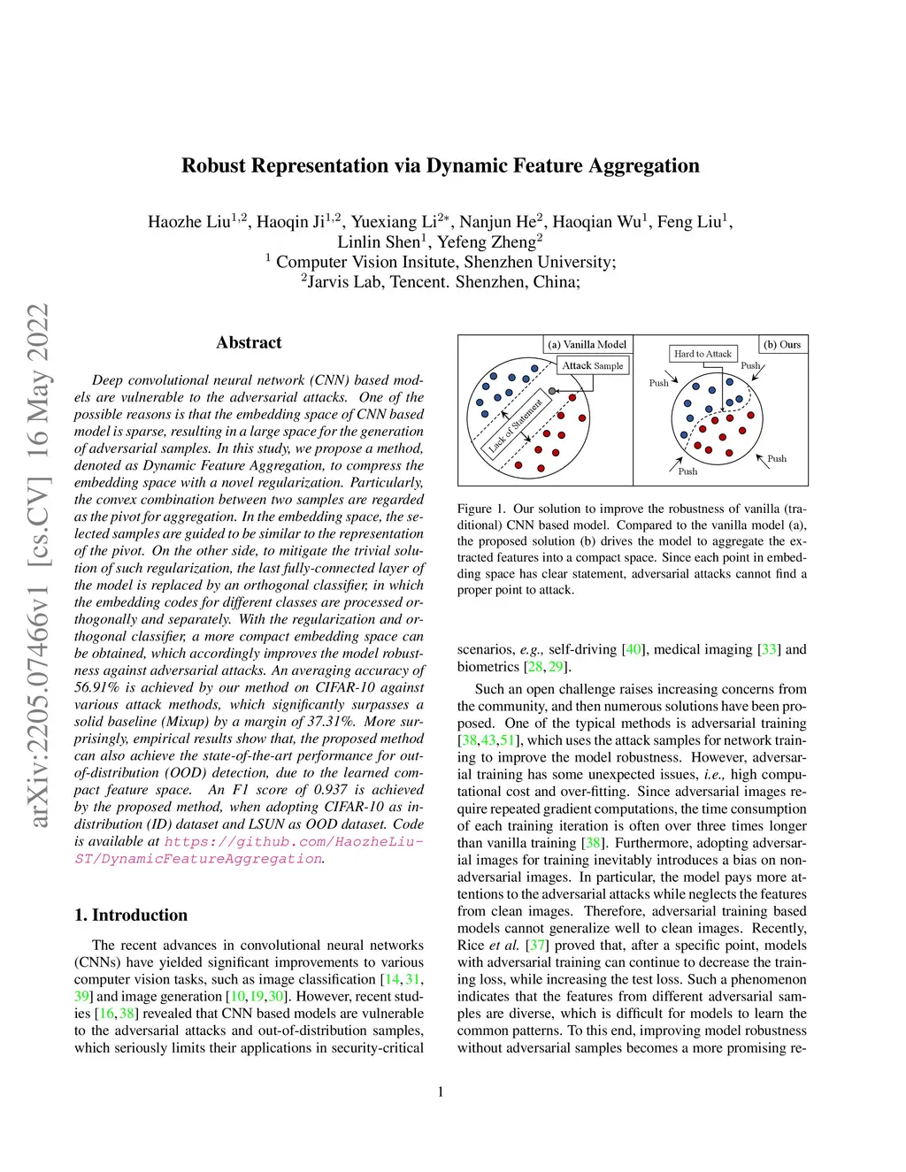 Deep convolutional neural network (CNN) based models are vulnerable to the adversarial attacks. One of the possible reasons is that the embedding space of CNN based model is sparse, resulting in a large space for the generation of adversarial samples. In this study, we propose a method, denoted as Dynamic Feature Aggregation, to compress the embedding space with a novel regularization. Particularly, the convex combination between two samples are regarded as the pivot for aggregation. In the embedding space, the selected samples are guided to be similar to the representation of the pivot. On the other side, to mitigate the trivial solution of such regularization, the last fully-connected layer of the model is replaced by an orthogonal classifier, in which the embedding codes for different classes are processed orthogonally and separately. With the regularization and orthogonal classifier, a more compact embedding space can be obtained, which accordingly improves the model robustness against adversarial attacks. An averaging accuracy of 56.91% is achieved by our method on CIFAR-10 against various attack methods, which significantly surpasses a solid baseline (Mixup) by a margin of 37.31%. More surprisingly, empirical results show that, the proposed method can also achieve the state-of-the-art performance for out-of-distribution (OOD) detection, due to the learned compact feature space. An F1 score of 0.937 is achieved by the proposed method, when adopting CIFAR-10 as in-distribution (ID) dataset and LSUN as OOD dataset. Code is available at https://github.com/HaozheLiu-ST/DynamicFeatureAggregation.