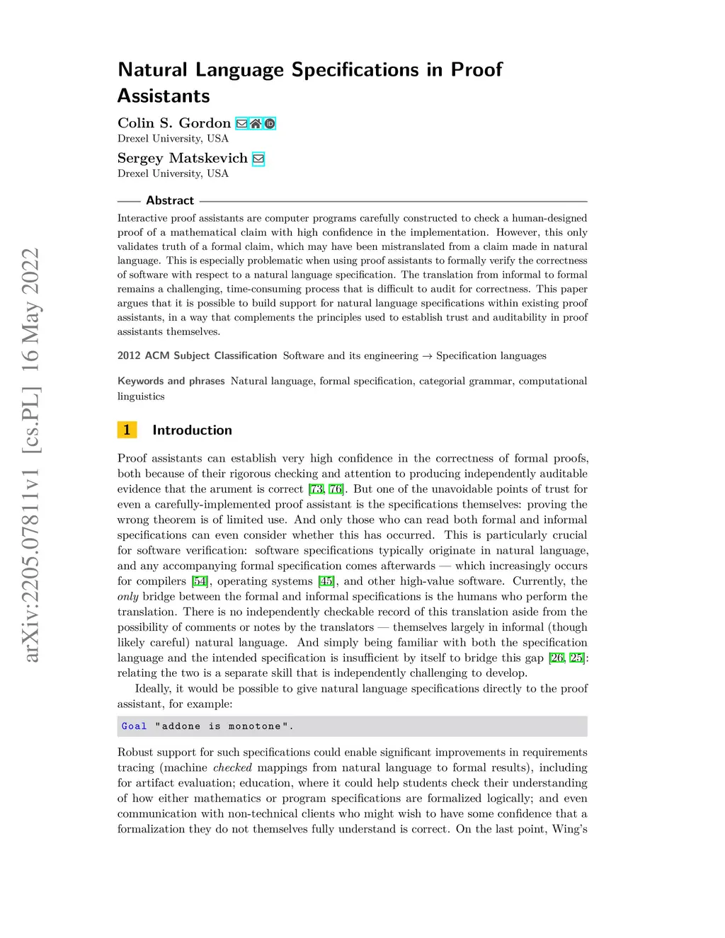 Interactive proof assistants are computer programs carefully constructed to check a human-designed proof of a mathematical claim with high confidence in the implementation. However, this only validates truth of a formal claim, which may have been mistranslated from a claim made in natural language. This is especially problematic when using proof assistants to formally verify the correctness of software with respect to a natural language specification. The translation from informal to formal remains a challenging, time-consuming process that is difficult to audit for correctness. This paper argues that it is possible to build support for natural language specifications within existing proof assistants, in a way that complements the principles used to establish trust and auditability in proof assistants themselves.