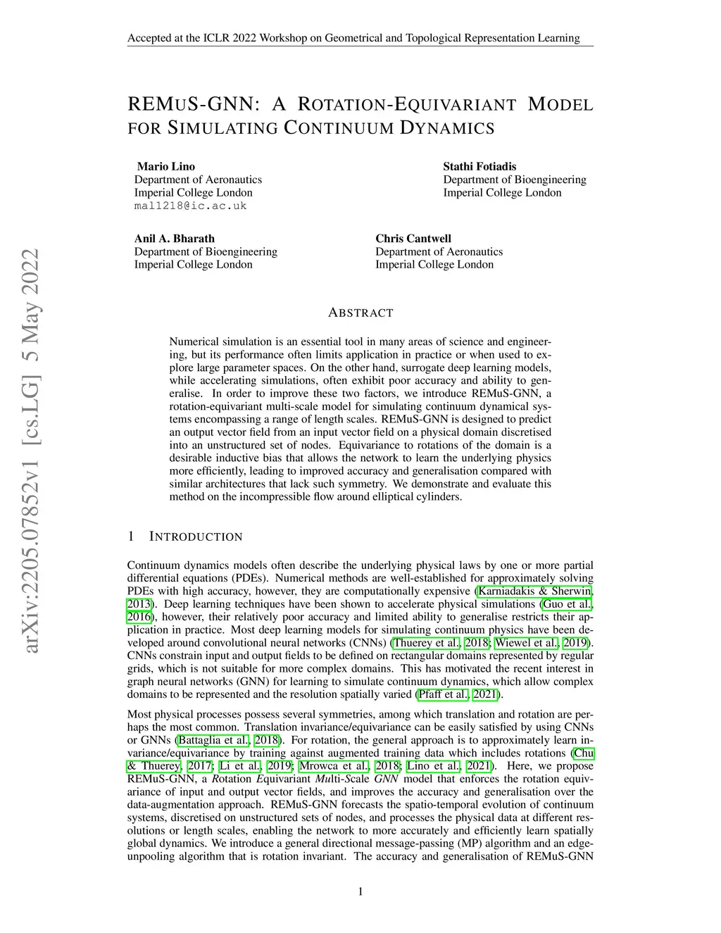 Numerical simulation is an essential tool in many areas of science and engineering, but its performance often limits application in practice or when used to explore large parameter spaces. On the other hand, surrogate deep learning models, while accelerating simulations, often exhibit poor accuracy and ability to generalise. In order to improve these two factors, we introduce REMuS-GNN, a rotation-equivariant multi-scale model for simulating continuum dynamical systems encompassing a range of length scales. REMuS-GNN is designed to predict an output vector field from an input vector field on a physical domain discretised into an unstructured set of nodes. Equivariance to rotations of the domain is a desirable inductive bias that allows the network to learn the underlying physics more efficiently, leading to improved accuracy and generalisation compared with similar architectures that lack such symmetry. We demonstrate and evaluate this method on the incompressible flow around elliptical cylinders.