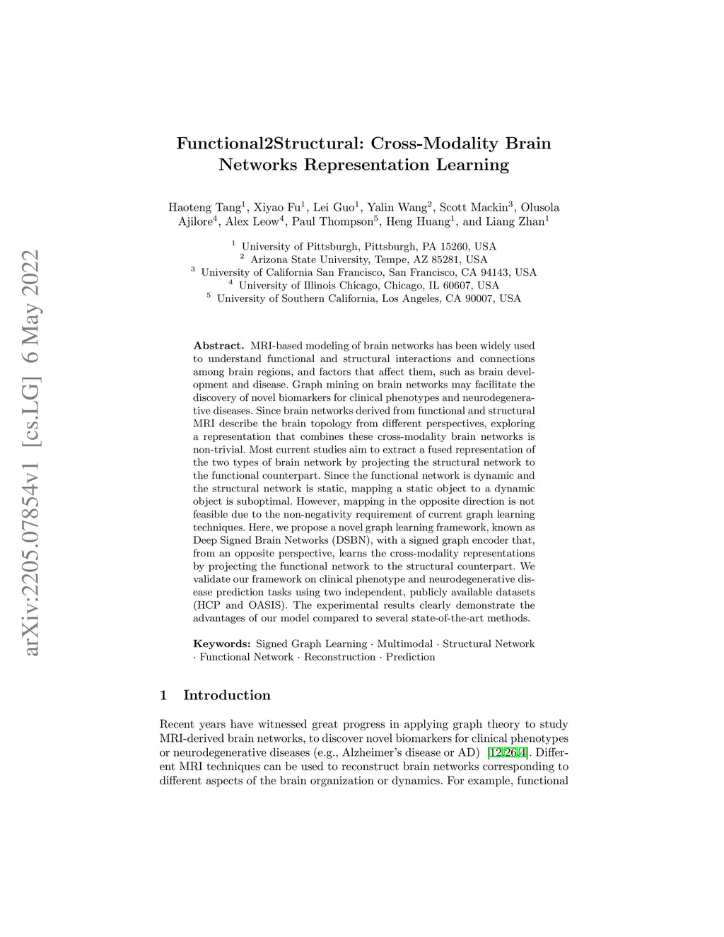 MRI-based modeling of brain networks has been widely used to understand functional and structural interactions and connections among brain regions, and factors that affect them, such as brain development and disease. Graph mining on brain networks may facilitate the discovery of novel biomarkers for clinical phenotypes and neurodegenerative diseases. Since brain networks derived from functional and structural MRI describe the brain topology from different perspectives, exploring a representation that combines these cross-modality brain networks is non-trivial. Most current studies aim to extract a fused representation of the two types of brain network by projecting the structural network to the functional counterpart. Since the functional network is dynamic and the structural network is static, mapping a static object to a dynamic object is suboptimal. However, mapping in the opposite direction is not feasible due to the non-negativity requirement of current graph learning techniques. Here, we propose a novel graph learning framework, known as Deep Signed Brain Networks (DSBN), with a signed graph encoder that, from an opposite perspective, learns the cross-modality representations by projecting the functional network to the structural counterpart. We validate our framework on clinical phenotype and neurodegenerative disease prediction tasks using two independent, publicly available datasets (HCP and OASIS). The experimental results clearly demonstrate the advantages of our model compared to several state-of-the-art methods.