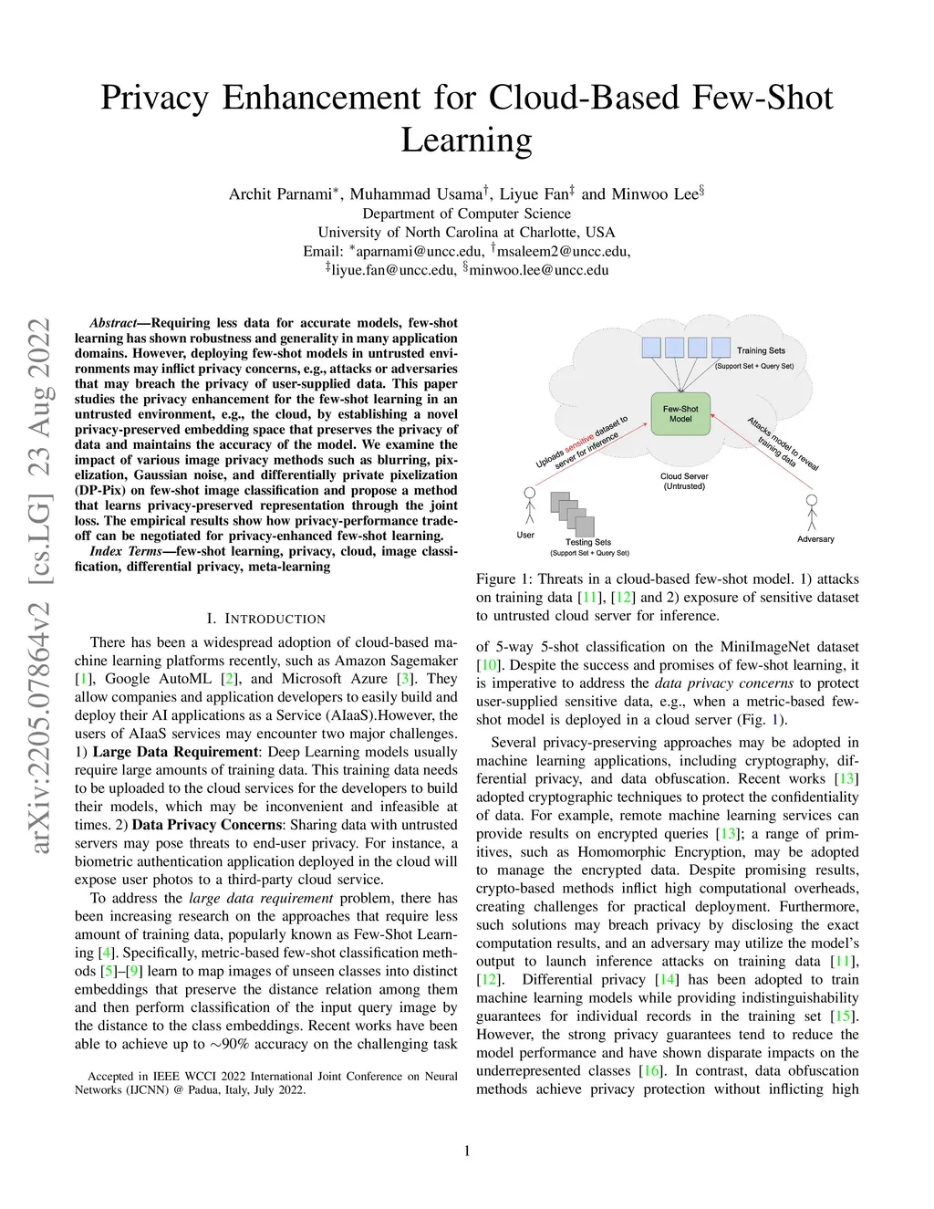 Privacy Enhancement for Cloud-Based Few-Shot Learning
