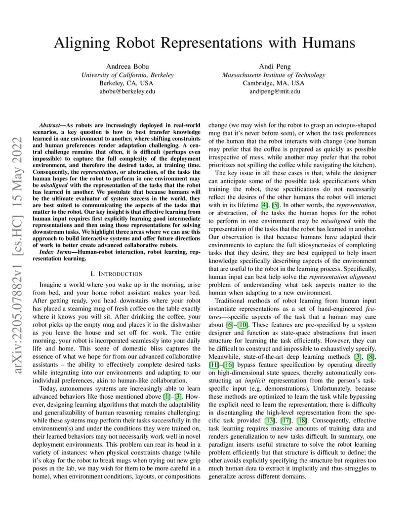 As robots are increasingly deployed in real-world scenarios, a key question is how to best transfer knowledge learned in one environment to another, where shifting constraints and human preferences render adaptation challenging. A central challenge remains that often, it is difficult (perhaps even impossible) to capture the full complexity of the deployment environment, and therefore the desired tasks, at training time. Consequently, the representation, or abstraction, of the tasks the human hopes for the robot to perform in one environment may be misaligned with the representation of the tasks that the robot has learned in another. We postulate that because humans will be the ultimate evaluator of system success in the world, they are best suited to communicating the aspects of the tasks that matter to the robot. Our key insight is that effective learning from human input requires first explicitly learning good intermediate representations and then using those representations for solving downstream tasks. We highlight three areas where we can use this approach to build interactive systems and offer future directions of work to better create advanced collaborative robots.