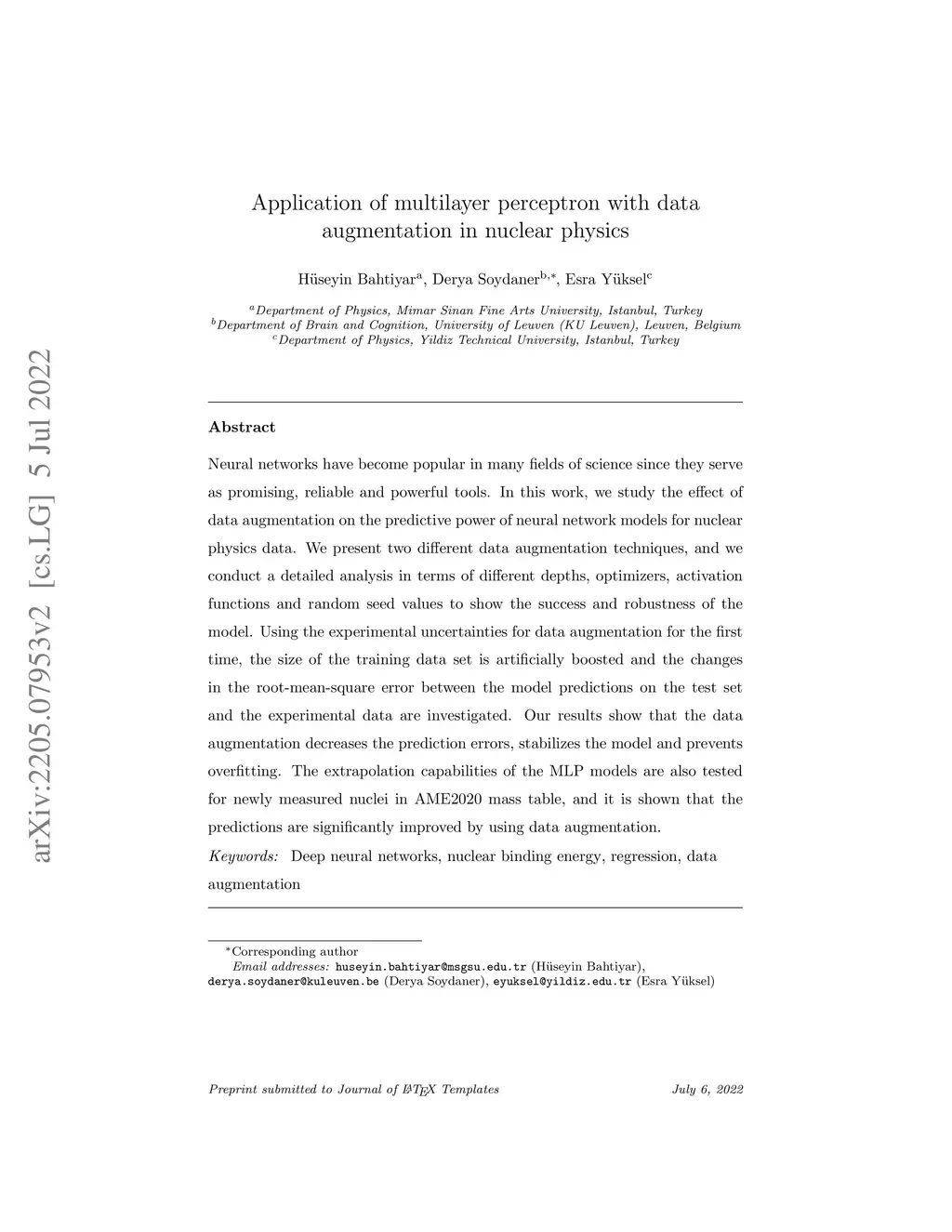 Neural networks have become popular in many fields of science since they serve as promising, reliable and powerful tools. In this work, we study the effect of data augmentation on the predictive power of neural network models for nuclear physics data. We present two different data augmentation techniques, and we conduct a detailed analysis in terms of different depths, optimizers, activation functions and random seed values to show the success and robustness of the model. Using the experimental uncertainties for data augmentation for the first time, the size of the training data set is artificially boosted and the changes in the root-mean-square error between the model predictions on the test set and the experimental data are investigated. Our results show that the data augmentation decreases the prediction errors, stabilizes the model and prevents overfitting. The extrapolation capabilities of the MLP models are also tested for newly measured nuclei in AME2020 mass table, and it is shown that the predictions are significantly improved by using data augmentation.