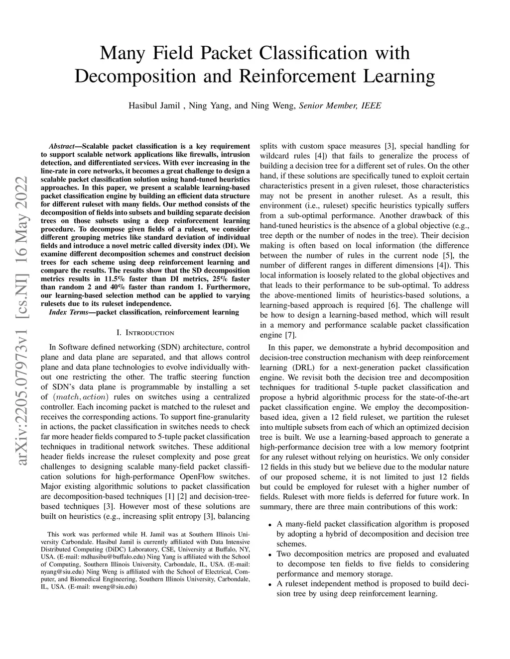 Scalable packet classification is a key requirement to support scalable network applications like firewalls, intrusion detection, and differentiated services. With ever increasing in the line-rate in core networks, it becomes a great challenge to design a scalable packet classification solution using hand-tuned heuristics approaches. In this paper, we present a scalable learning-based packet classification engine by building an efficient data structure for different ruleset with many fields. Our method consists of the decomposition of fields into subsets and building separate decision trees on those subsets using a deep reinforcement learning procedure. To decompose given fields of a ruleset, we consider different grouping metrics like standard deviation of individual fields and introduce a novel metric called diversity index (DI). We examine different decomposition schemes and construct decision trees for each scheme using deep reinforcement learning and compare the results. The results show that the SD decomposition metrics results in 11.5% faster than DI metrics, 25% faster than random 2 and 40% faster than random 1. Furthermore, our learning-based selection method can be applied to varying rulesets due to its ruleset independence.