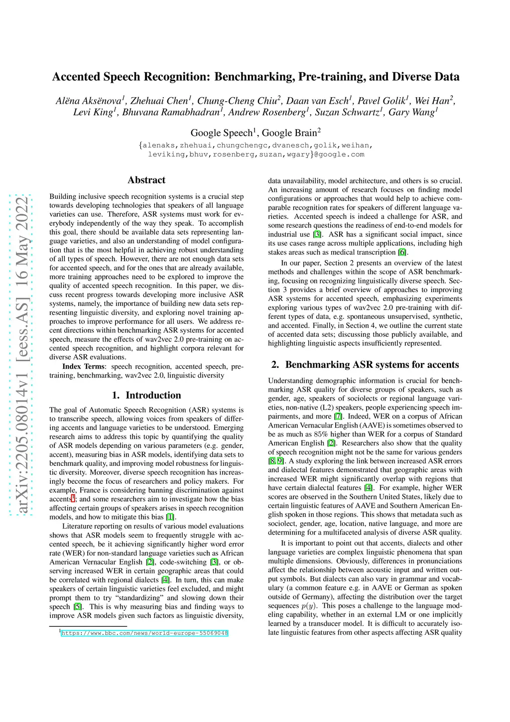 Building inclusive speech recognition systems is a crucial step towards developing technologies that speakers of all language varieties can use. Therefore, ASR systems must work for everybody independently of the way they speak. To accomplish this goal, there should be available data sets representing language varieties, and also an understanding of model configuration that is the most helpful in achieving robust understanding of all types of speech. However, there are not enough data sets for accented speech, and for the ones that are already available, more training approaches need to be explored to improve the quality of accented speech recognition. In this paper, we discuss recent progress towards developing more inclusive ASR systems, namely, the importance of building new data sets representing linguistic diversity, and exploring novel training approaches to improve performance for all users. We address recent directions within benchmarking ASR systems for accented speech, measure the effects of wav2vec 2.0 pre-training on accented speech recognition, and highlight corpora relevant for diverse ASR evaluations.