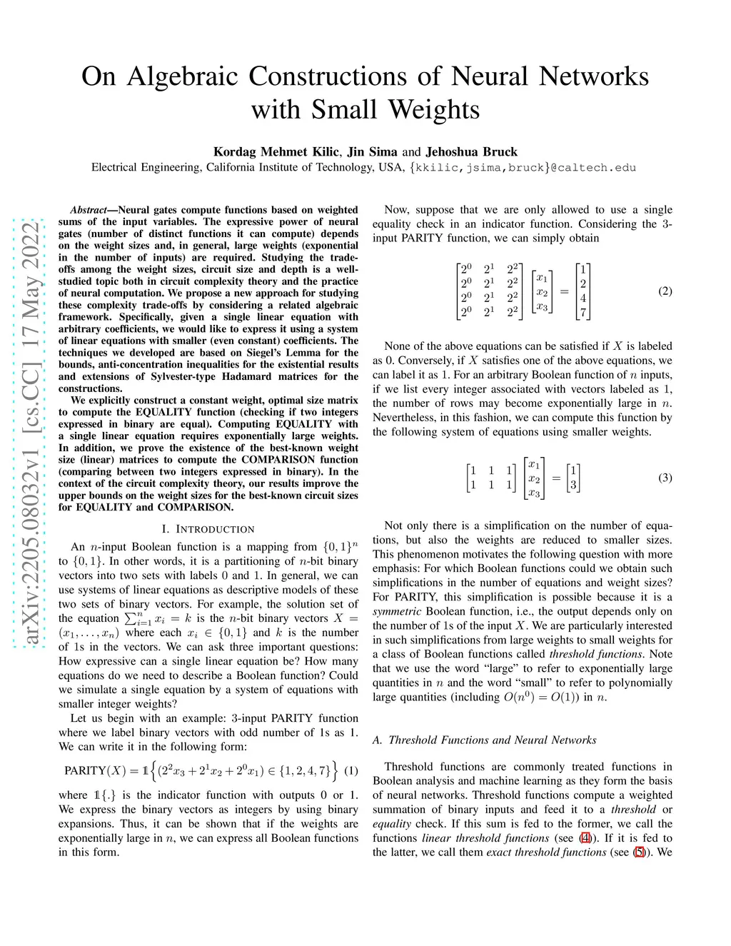 Neural gates compute functions based on weighted sums of the input variables. The expressive power of neural gates (number of distinct functions it can compute) depends on the weight sizes and, in general, large weights (exponential in the number of inputs) are required. Studying the trade-offs among the weight sizes, circuit size and depth is a well-studied topic both in circuit complexity theory and the practice of neural computation. We propose a new approach for studying these complexity trade-offs by considering a related algebraic framework. Specifically, given a single linear equation with arbitrary coefficients, we would like to express it using a system of linear equations with smaller (even constant) coefficients. The techniques we developed are based on Siegel's Lemma for the bounds, anti-concentration inequalities for the existential results and extensions of Sylvester-type Hadamard matrices for the constructions. We explicitly construct a constant weight, optimal size matrix to compute the EQUALITY function (checking if two integers expressed in binary are equal). Computing EQUALITY with a single linear equation requires exponentially large weights. In addition, we prove the existence of the best-known weight size (linear) matrices to compute the COMPARISON function (comparing between two integers expressed in binary). In the context of the circuit complexity theory, our results improve the upper bounds on the weight sizes for the best-known circuit sizes for EQUALITY and COMPARISON.
