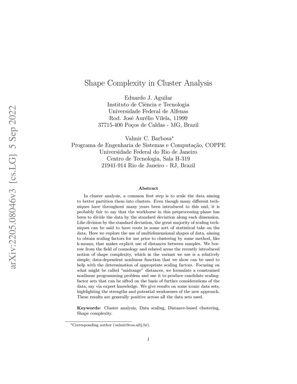 In cluster analysis, a common first step is to scale the data aiming to better partition them into clusters. Even though many different techniques have throughout many years been introduced to this end, it is probably fair to say that the workhorse in this preprocessing phase has been to divide the data by the standard deviation along each dimension. Like division by the standard deviation, the great majority of scaling techniques can be said to have roots in some sort of statistical take on the data. Here we explore the use of multidimensional shapes of data, aiming to obtain scaling factors for use prior to clustering by some method, like k-means, that makes explicit use of distances between samples. We borrow from the field of cosmology and related areas the recently introduced notion of shape complexity, which in the variant we use is a relatively simple, data-dependent nonlinear function that we show can be used to help with the determination of appropriate scaling factors. Focusing on what might be called "midrange" distances, we formulate a constrained nonlinear programming problem and use it to produce candidate scaling-factor sets that can be sifted on the basis of further considerations of the data, say via expert knowledge. We give results on some iconic data sets, highlighting the strengths and potential weaknesses of the new approach. These results are generally positive across all the data sets used.