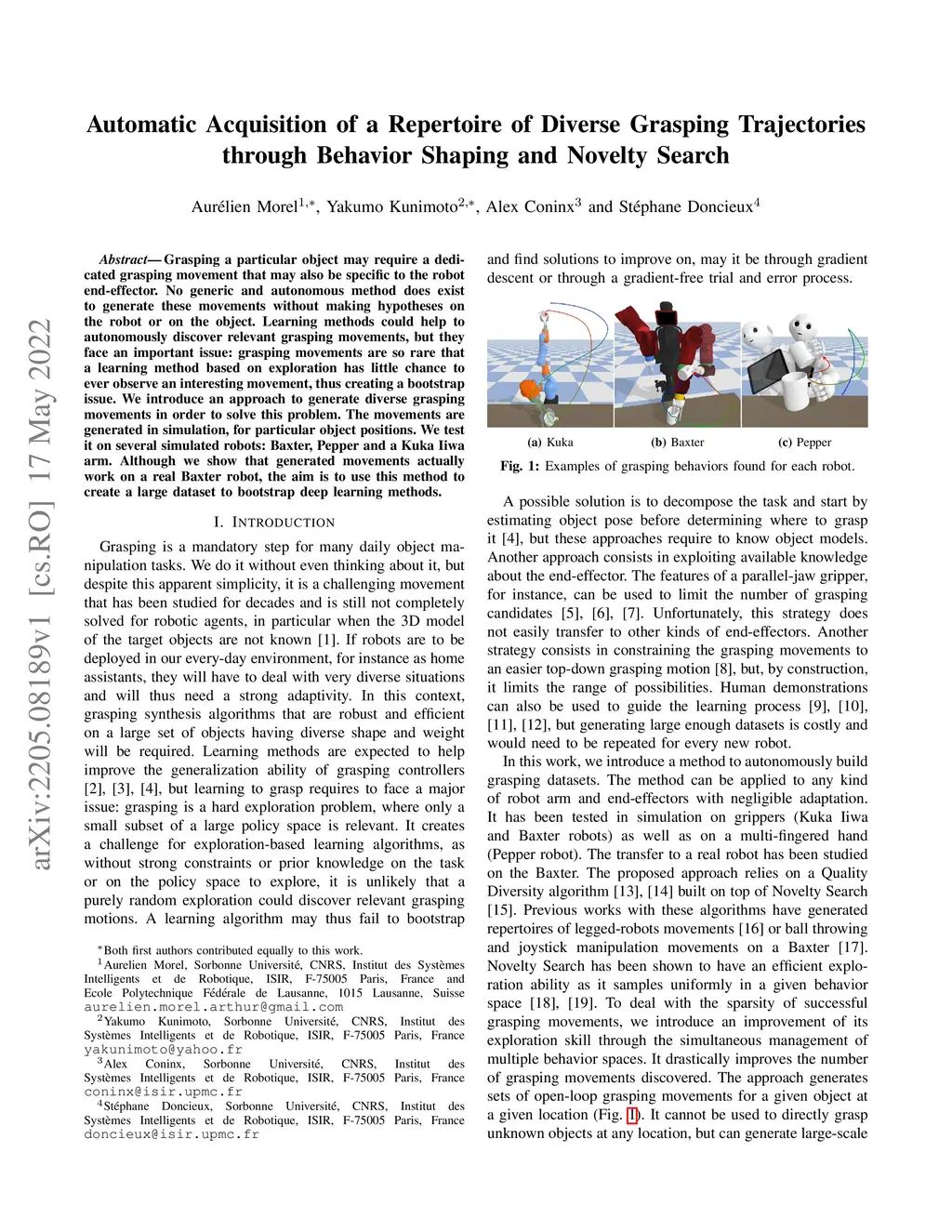 Grasping a particular object may require a dedicated grasping movement that may also be specific to the robot end-effector. No generic and autonomous method does exist to generate these movements without making hypotheses on the robot or on the object. Learning methods could help to autonomously discover relevant grasping movements, but they face an important issue: grasping movements are so rare that a learning method based on exploration has little chance to ever observe an interesting movement, thus creating a bootstrap issue. We introduce an approach to generate diverse grasping movements in order to solve this problem. The movements are generated in simulation, for particular object positions. We test it on several simulated robots: Baxter, Pepper and a Kuka Iiwa arm. Although we show that generated movements actually work on a real Baxter robot, the aim is to use this method to create a large dataset to bootstrap deep learning methods.
