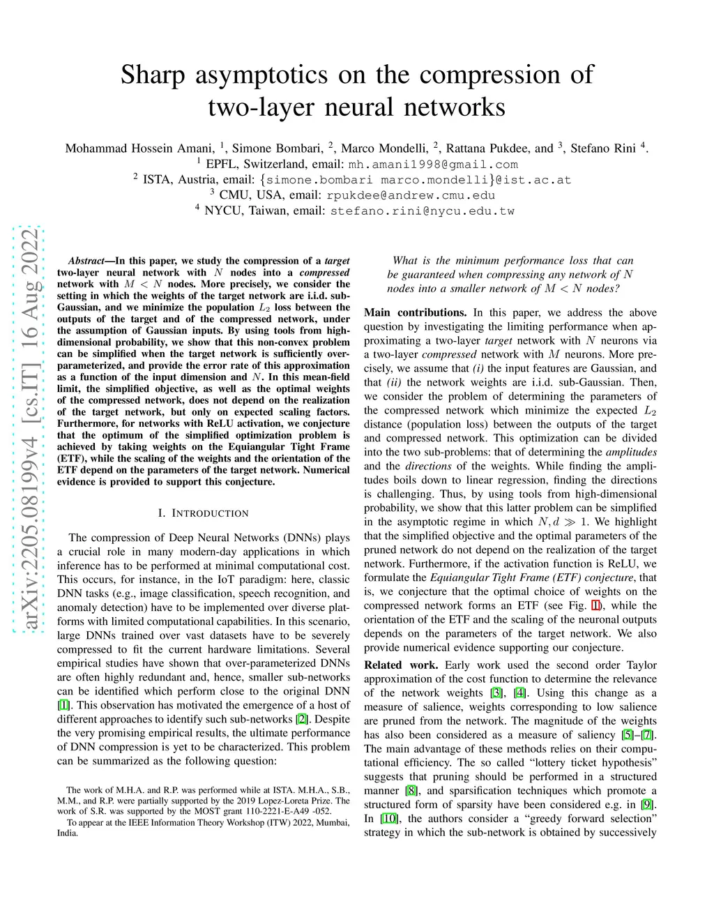 In this paper, we study the compression of a target two-layer neural network with N nodes into a compressed network with M<N nodes. More precisely, we consider the setting in which the weights of the target network are i.i.d. sub-Gaussian, and we minimize the population L_2 loss between the outputs of the target and of the compressed network, under the assumption of Gaussian inputs. By using tools from high-dimensional probability, we show that this non-convex problem can be simplified when the target network is sufficiently over-parameterized, and provide the error rate of this approximation as a function of the input dimension and N. In this mean-field limit, the simplified objective, as well as the optimal weights of the compressed network, does not depend on the realization of the target network, but only on expected scaling factors. Furthermore, for networks with ReLU activation, we conjecture that the optimum of the simplified optimization problem is achieved by taking weights on the Equiangular Tight Frame (ETF), while the scaling of the weights and the orientation of the ETF depend on the parameters of the target network. Numerical evidence is provided to support this conjecture.