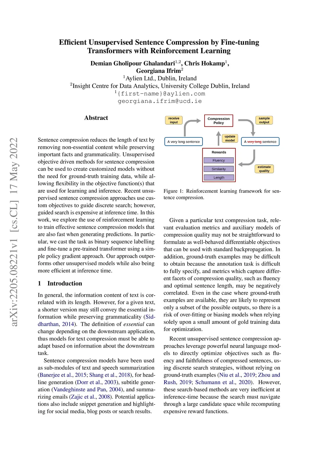 Sentence compression reduces the length of text by removing non-essential content while preserving important facts and grammaticality. Unsupervised objective driven methods for sentence compression can be used to create customized models without the need for ground-truth training data, while allowing flexibility in the objective function(s) that are used for learning and inference. Recent unsupervised sentence compression approaches use custom objectives to guide discrete search; however, guided search is expensive at inference time. In this work, we explore the use of reinforcement learning to train effective sentence compression models that are also fast when generating predictions. In particular, we cast the task as binary sequence labelling and fine-tune a pre-trained transformer using a simple policy gradient approach. Our approach outperforms other unsupervised models while also being more efficient at inference time.