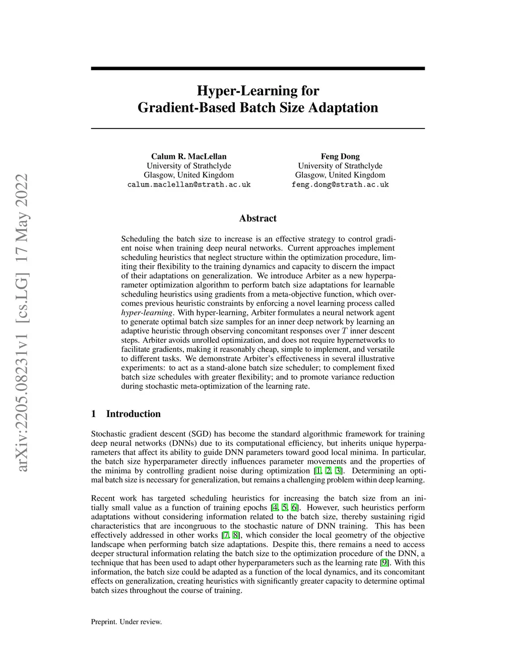 Scheduling the batch size to increase is an effective strategy to control gradient noise when training deep neural networks. Current approaches implement scheduling heuristics that neglect structure within the optimization procedure, limiting their flexibility to the training dynamics and capacity to discern the impact of their adaptations on generalization. We introduce Arbiter as a new hyperparameter optimization algorithm to perform batch size adaptations for learnable scheduling heuristics using gradients from a meta-objective function, which overcomes previous heuristic constraints by enforcing a novel learning process called hyper-learning. With hyper-learning, Arbiter formulates a neural network agent to generate optimal batch size samples for an inner deep network by learning an adaptive heuristic through observing concomitant responses over T inner descent steps. Arbiter avoids unrolled optimization, and does not require hypernetworks to facilitate gradients, making it reasonably cheap, simple to implement, and versatile to different tasks. We demonstrate Arbiter's effectiveness in several illustrative experiments: to act as a stand-alone batch size scheduler; to complement fixed batch size schedules with greater flexibility; and to promote variance reduction during stochastic meta-optimization of the learning rate.