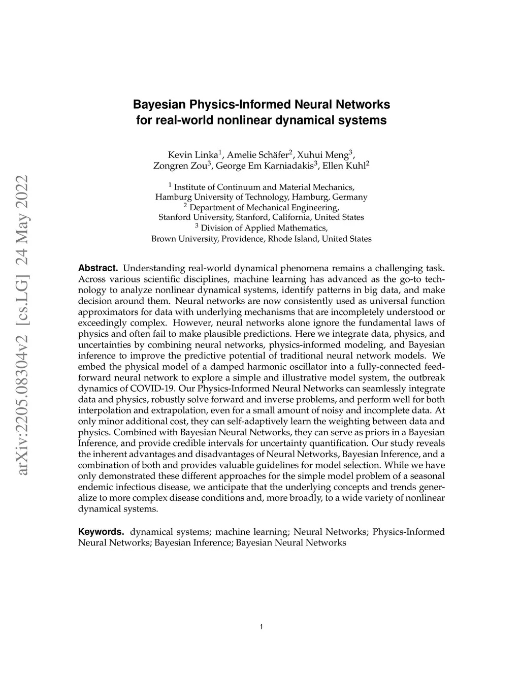 Understanding real-world dynamical phenomena remains a challenging task. Across various scientific disciplines, machine learning has advanced as the go-to technology to analyze nonlinear dynamical systems, identify patterns in big data, and make decision around them. Neural networks are now consistently used as universal function approximators for data with underlying mechanisms that are incompletely understood or exceedingly complex. However, neural networks alone ignore the fundamental laws of physics and often fail to make plausible predictions. Here we integrate data, physics, and uncertainties by combining neural networks, physics-informed modeling, and Bayesian inference to improve the predictive potential of traditional neural network models. We embed the physical model of a damped harmonic oscillator into a fully-connected feed-forward neural network to explore a simple and illustrative model system, the outbreak dynamics of COVID-19. Our Physics-Informed Neural Networks can seamlessly integrate data and physics, robustly solve forward and inverse problems, and perform well for both interpolation and extrapolation, even for a small amount of noisy and incomplete data. At only minor additional cost, they can self-adaptively learn the weighting between data and physics. Combined with Bayesian Neural Networks, they can serve as priors in a Bayesian Inference, and provide credible intervals for uncertainty quantification. Our study reveals the inherent advantages and disadvantages of Neural Networks, Bayesian Inference, and a combination of both and provides valuable guidelines for model selection. While we have only demonstrated these approaches for the simple model problem of a seasonal endemic infectious disease, we anticipate that the underlying concepts and trends generalize to more complex disease conditions and, more broadly, to a wide variety of nonlinear dynamical systems.