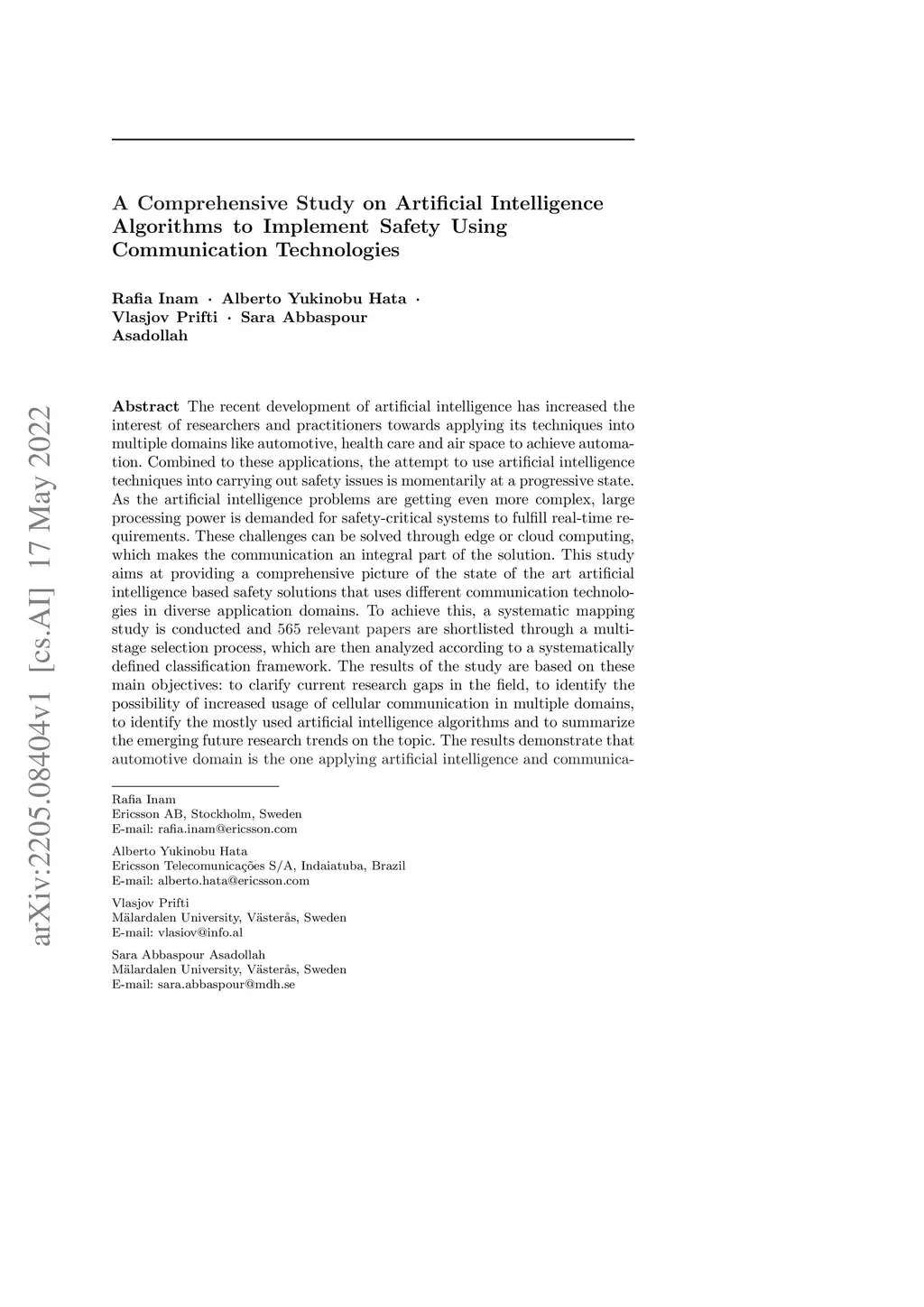 The recent development of artificial intelligence (AI) has increased the interest of researchers and practitioners towards applying its techniques into multiple domains like automotive, health care and air space to achieve automation. Combined to these applications, the attempt to use AI techniques into carrying out safety issues is momentarily at a progressive state. As AI problems are getting even more complex, large processing power is demanded for safety-critical systems to fulfill real-time requirements. These challenges can be solved through edge or cloud computing, which makes the communication an integral part of the solution. This study aims at providing a comprehensive picture of the state of the art AI based safety solutions that uses different communication technologies in diverse application domains. To achieve this, a systematic mapping study is conducted and 565 relevant papers are shortlisted through a multistage selection process, which are then analyzed according to a systematically defined classification framework. The results of the study are based on these main objectives: to clarify current research gaps in the field, to identify the possibility of increased usage of cellular communication in multiple domains, to identify the mostly used AI algorithms and to summarize the emerging future research trends on the topic. The results demonstrate that automotive domain is the one applying AI and communication the most to implement safety and the most used AI in this domain is neural networks, clustering and computer vision; applying cellular communication to automotive domain is highest; the use of non-cellular communication technologies is dominant however a clear trend of a rapid increase in the use of cellular communication is observed specially from 2020 with the roll-out of 5G technology.