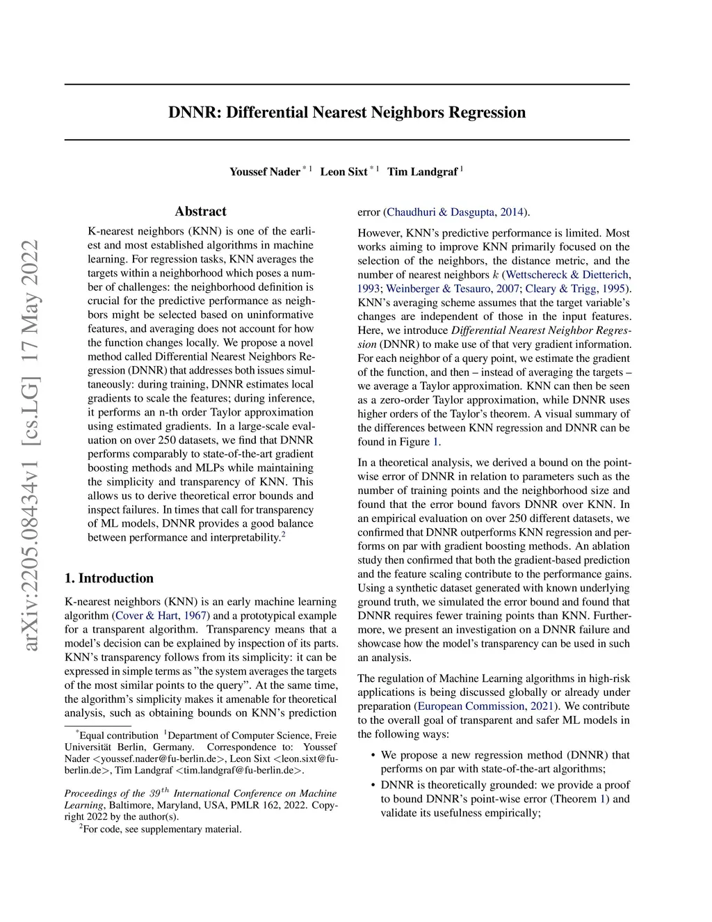 K-nearest neighbors (KNN) is one of the earliest and most established algorithms in machine learning. For regression tasks, KNN averages the targets within a neighborhood which poses a number of challenges: the neighborhood definition is crucial for the predictive performance as neighbors might be selected based on uninformative features, and averaging does not account for how the function changes locally. We propose a novel method called Differential Nearest Neighbors Regression (DNNR) that addresses both issues simultaneously: during training, DNNR estimates local gradients to scale the features; during inference, it performs an n-th order Taylor approximation using estimated gradients. In a large-scale evaluation on over 250 datasets, we find that DNNR performs comparably to state-of-the-art gradient boosting methods and MLPs while maintaining the simplicity and transparency of KNN. This allows us to derive theoretical error bounds and inspect failures. In times that call for transparency of ML models, DNNR provides a good balance between performance and interpretability.