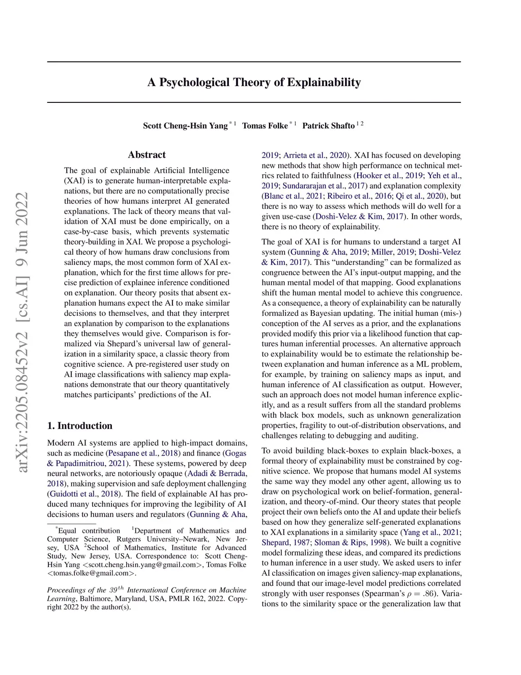 The goal of explainable Artificial Intelligence (XAI) is to generate human-interpretable explanations, but there are no computationally precise theories of how humans interpret AI generated explanations. The lack of theory means that validation of XAI must be done empirically, on a case-by-case basis, which prevents systematic theory-building in XAI. We propose a psychological theory of how humans draw conclusions from saliency maps, the most common form of XAI explanation, which for the first time allows for precise prediction of explainee inference conditioned on explanation. Our theory posits that absent explanation humans expect the AI to make similar decisions to themselves, and that they interpret an explanation by comparison to the explanations they themselves would give. Comparison is formalized via Shepard's universal law of generalization in a similarity space, a classic theory from cognitive science. A pre-registered user study on AI image classifications with saliency map explanations demonstrate that our theory quantitatively matches participants' predictions of the AI.