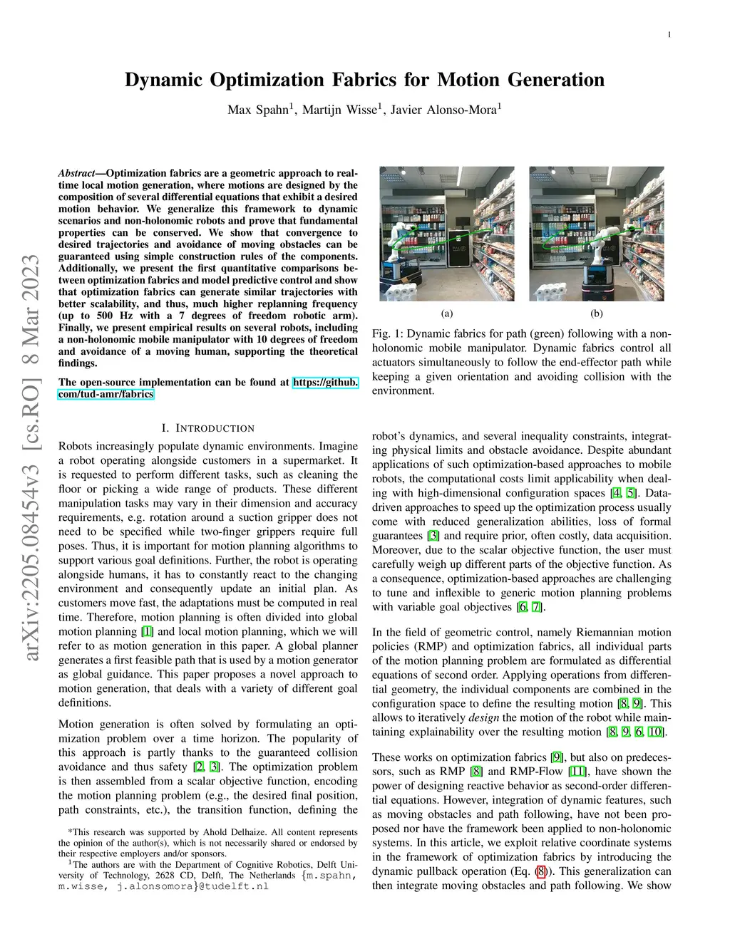 Optimization fabrics are a geometric approach to real-time local motion generation, where motions are designed by the composition of several differential equations that exhibit a desired motion behavior. We generalize this framework to dynamic scenarios and non-holonomic robots and prove that fundamental properties can be conserved. We show that convergence to desired trajectories and avoidance of moving obstacles can be guaranteed using simple construction rules of the components. Additionally, we present the first quantitative comparisons between optimization fabrics and model predictive control and show that optimization fabrics can generate similar trajectories with better scalability, and thus, much higher replanning frequency (up to 500 Hz with a 7 degrees of freedom robotic arm). Finally, we present empirical results on several robots, including a non-holonomic mobile manipulator with 10 degrees of freedom and avoidance of a moving human, supporting the theoretical findings.