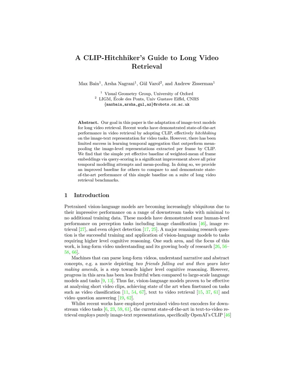 Our goal in this paper is the adaptation of image-text models for long video retrieval. Recent works have demonstrated state-of-the-art performance in video retrieval by adopting CLIP, effectively hitchhiking on the image-text representation for video tasks. However, there has been limited success in learning temporal aggregation that outperform mean-pooling the image-level representations extracted per frame by CLIP. We find that the simple yet effective baseline of weighted-mean of frame embeddings via query-scoring is a significant improvement above all prior temporal modelling attempts and mean-pooling. In doing so, we provide an improved baseline for others to compare to and demonstrate state-of-the-art performance of this simple baseline on a suite of long video retrieval benchmarks.