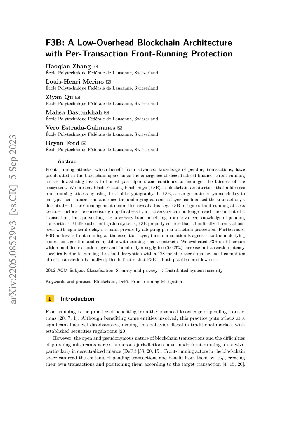 Front-running attacks, which benefit from advanced knowledge of pending transactions, have proliferated in the blockchain space since the emergence of decentralized finance. Front-running causes devastating losses to honest participants and continues to endanger the fairness of the ecosystem. We present Flash Freezing Flash Boys (F3B), a blockchain architecture that addresses front-running attacks by using threshold cryptography. In F3B, a user generates a symmetric key to encrypt their transaction, and once the underlying consensus layer has finalized the transaction, a decentralized secret-management committee reveals this key. F3B mitigates front-running attacks because, before the consensus group finalizes it, an adversary can no longer read the content of a transaction, thus preventing the adversary from benefiting from advanced knowledge of pending transactions. Unlike other mitigation systems, F3B properly ensures that all unfinalized transactions, even with significant delays, remain private by adopting per-transaction protection. Furthermore, F3B addresses front-running at the execution layer; thus, our solution is agnostic to the underlying consensus algorithm and compatible with existing smart contracts. We evaluated F3B on Ethereum with a modified execution layer and found only a negligible (0.026%) increase in transaction latency, specifically due to running threshold decryption with a 128-member secret-management committee after a transaction is finalized; this indicates that F3B is both practical and low-cost.
