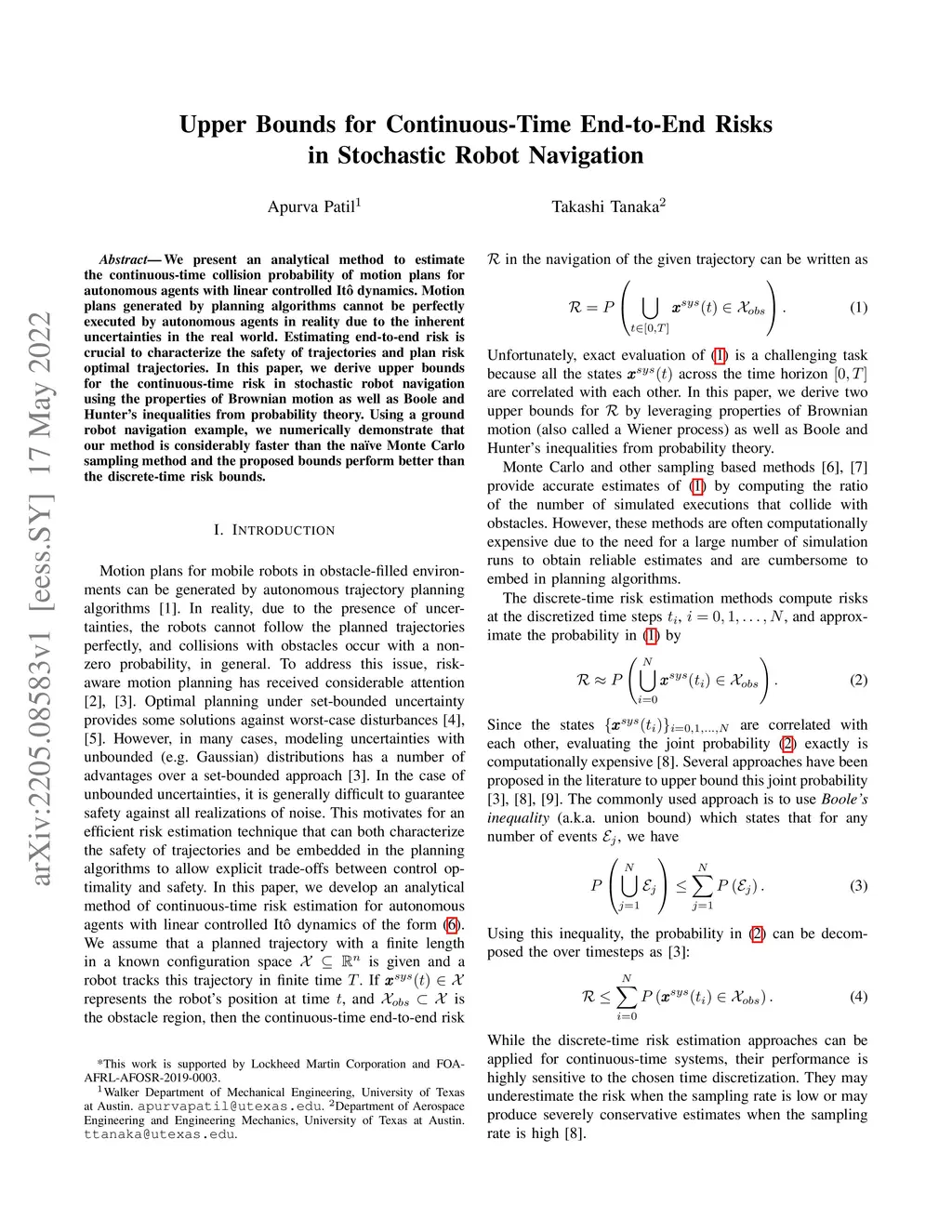We present an analytical method to estimate the continuous-time collision probability of motion plans for autonomous agents with linear controlled Ito dynamics. Motion plans generated by planning algorithms cannot be perfectly executed by autonomous agents in reality due to the inherent uncertainties in the real world. Estimating end-to-end risk is crucial to characterize the safety of trajectories and plan risk optimal trajectories. In this paper, we derive upper bounds for the continuous-time risk in stochastic robot navigation using the properties of Brownian motion as well as Boole and Hunter's inequalities from probability theory. Using a ground robot navigation example, we numerically demonstrate that our method is considerably faster than the naive Monte Carlo sampling method and the proposed bounds perform better than the discrete-time risk bounds.