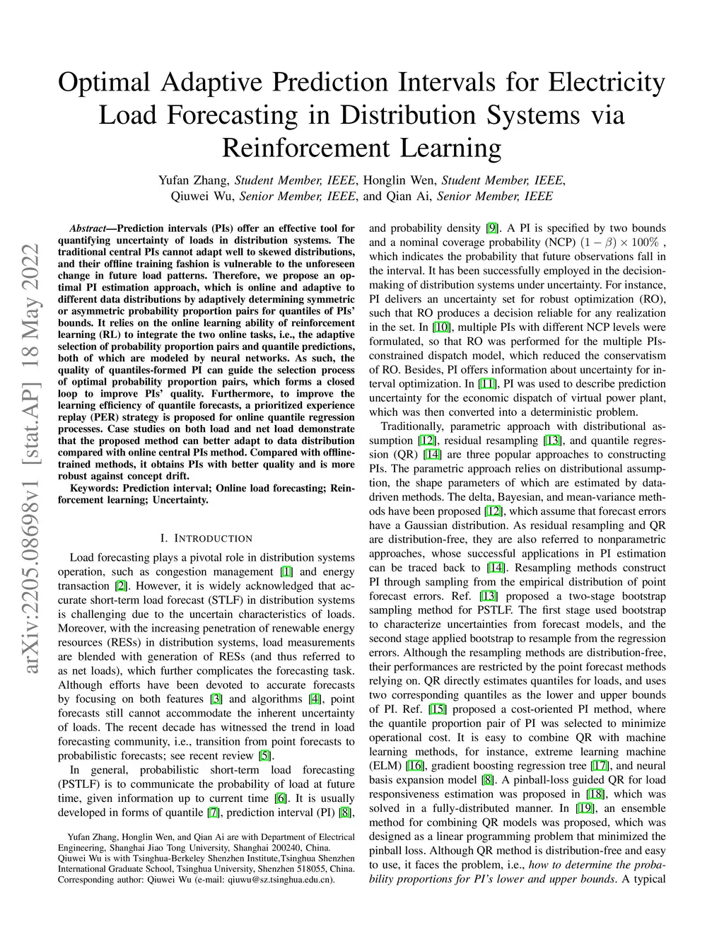 Prediction intervals offer an effective tool for quantifying the uncertainty of loads in distribution systems. The traditional central PIs cannot adapt well to skewed distributions, and their offline training fashion is vulnerable to unforeseen changes in future load patterns. Therefore, we propose an optimal PI estimation approach, which is online and adaptive to different data distributions by adaptively determining symmetric or asymmetric probability proportion pairs for quantiles. It relies on the online learning ability of reinforcement learning to integrate the two online tasks, i.e., the adaptive selection of probability proportion pairs and quantile predictions, both of which are modeled by neural networks. As such, the quality of quantiles-formed PI can guide the selection process of optimal probability proportion pairs, which forms a closed loop to improve the quality of PIs. Furthermore, to improve the learning efficiency of quantile forecasts, a prioritized experience replay strategy is proposed for online quantile regression processes. Case studies on both load and net load demonstrate that the proposed method can better adapt to data distribution compared with online central PIs method. Compared with offline-trained methods, it obtains PIs with better quality and is more robust against concept drift.