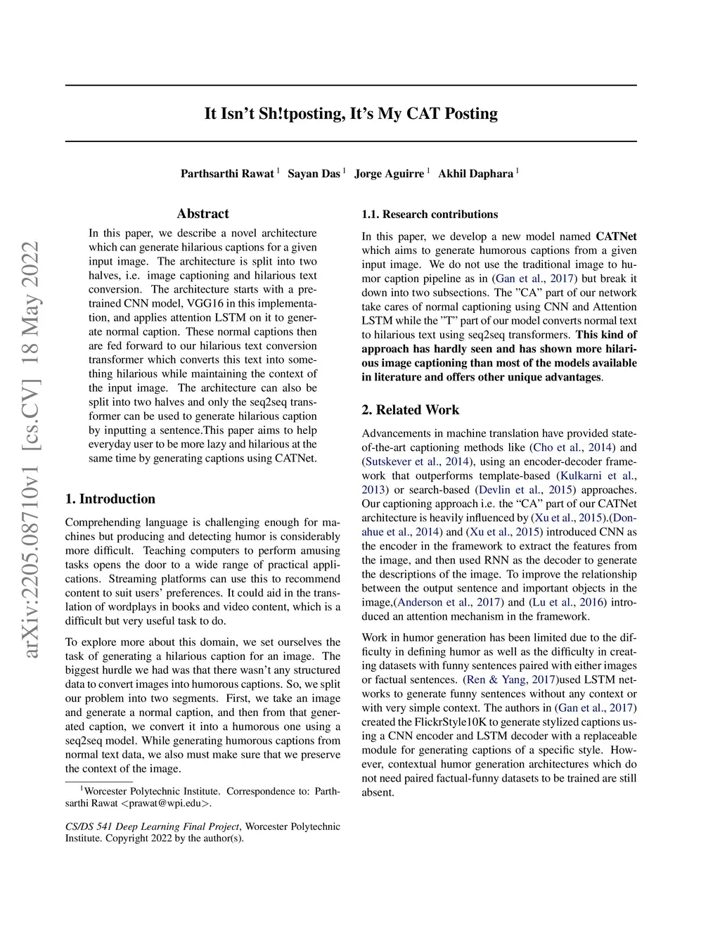 In this paper, we describe a novel architecture which can generate hilarious captions for a given input image. The architecture is split into two halves, i.e. image captioning and hilarious text conversion. The architecture starts with a pre-trained CNN model, VGG16 in this implementation, and applies attention LSTM on it to generate normal caption. These normal captions then are fed forward to our hilarious text conversion transformer which converts this text into something hilarious while maintaining the context of the input image. The architecture can also be split into two halves and only the seq2seq transformer can be used to generate hilarious caption by inputting a sentence.This paper aims to help everyday user to be more lazy and hilarious at the same time by generating captions using CATNet.