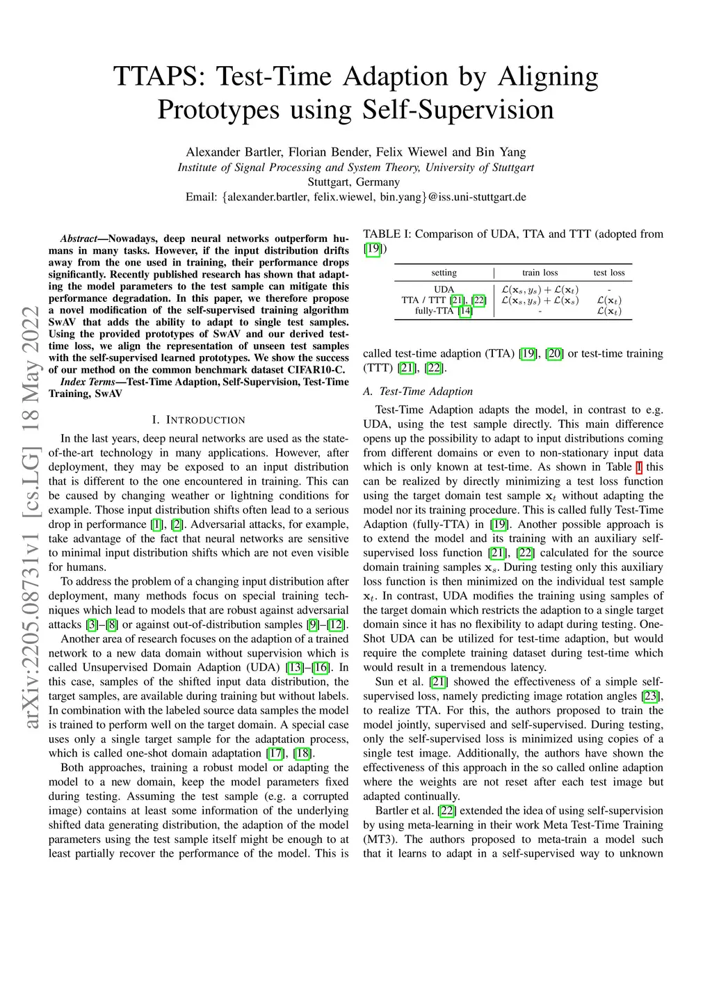Nowadays, deep neural networks outperform humans in many tasks. However, if the input distribution drifts away from the one used in training, their performance drops significantly. Recently published research has shown that adapting the model parameters to the test sample can mitigate this performance degradation. In this paper, we therefore propose a novel modification of the self-supervised training algorithm SwAV that adds the ability to adapt to single test samples. Using the provided prototypes of SwAV and our derived test-time loss, we align the representation of unseen test samples with the self-supervised learned prototypes. We show the success of our method on the common benchmark dataset CIFAR10-C.