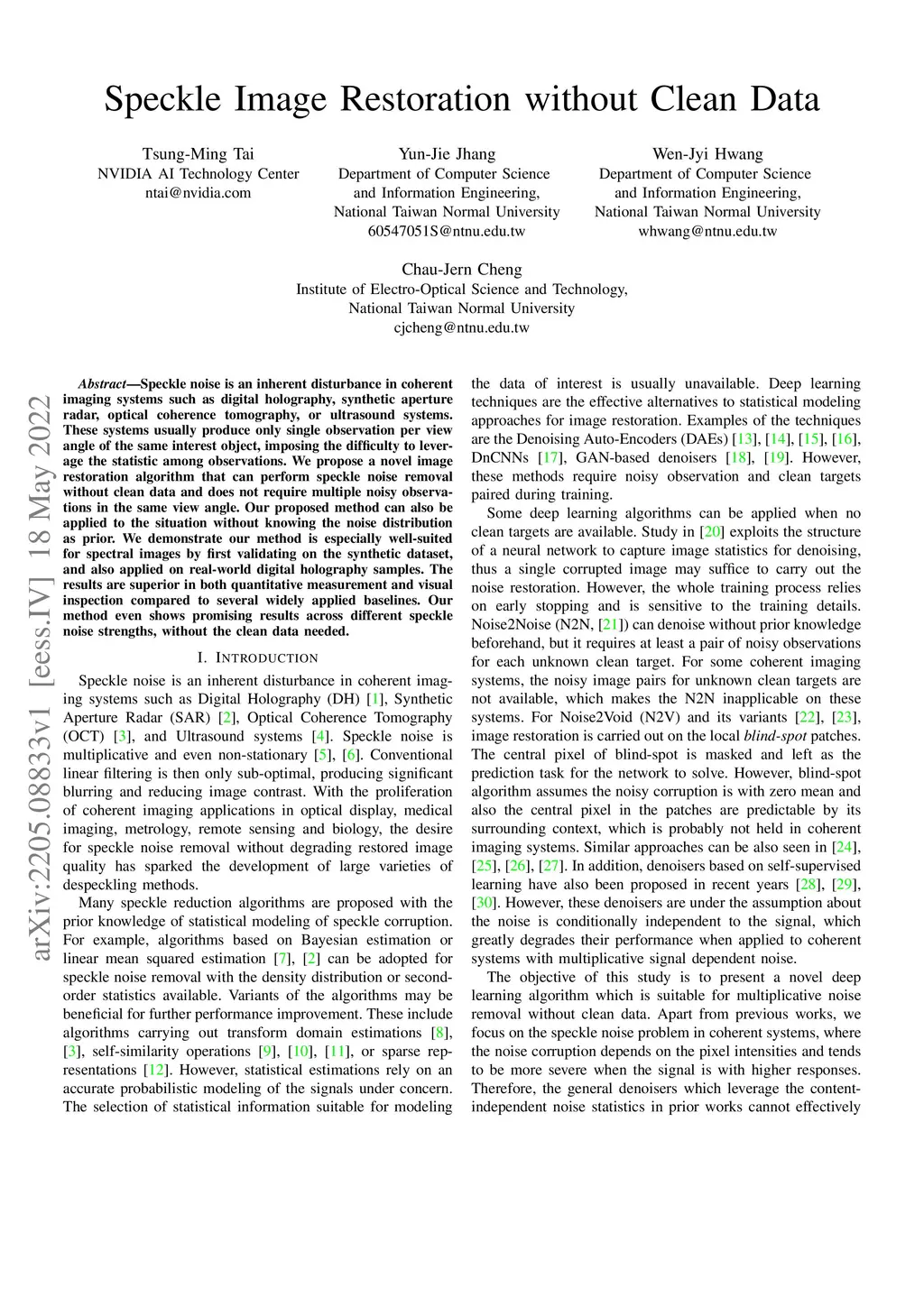 Speckle noise is an inherent disturbance in coherent imaging systems such as digital holography, synthetic aperture radar, optical coherence tomography, or ultrasound systems. These systems usually produce only single observation per view angle of the same interest object, imposing the difficulty to leverage the statistic among observations. We propose a novel image restoration algorithm that can perform speckle noise removal without clean data and does not require multiple noisy observations in the same view angle. Our proposed method can also be applied to the situation without knowing the noise distribution as prior. We demonstrate our method is especially well-suited for spectral images by first validating on the synthetic dataset, and also applied on real-world digital holography samples. The results are superior in both quantitative measurement and visual inspection compared to several widely applied baselines. Our method even shows promising results across different speckle noise strengths, without the clean data needed.