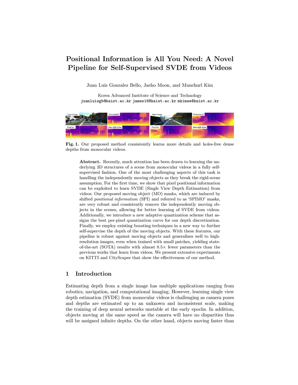 Recently, much attention has been drawn to learning the underlying 3D structures of a scene from monocular videos in a fully self-supervised fashion. One of the most challenging aspects of this task is handling the independently moving objects as they break the rigid-scene assumption. For the first time, we show that pixel positional information can be exploited to learn SVDE (Single View Depth Estimation) from videos. Our proposed moving object (MO) masks, which are induced by shifted positional information (SPI) and referred to as `SPIMO' masks, are very robust and consistently remove the independently moving objects in the scenes, allowing for better learning of SVDE from videos. Additionally, we introduce a new adaptive quantization scheme that assigns the best per-pixel quantization curve for our depth discretization. Finally, we employ existing boosting techniques in a new way to further self-supervise the depth of the moving objects. With these features, our pipeline is robust against moving objects and generalizes well to high-resolution images, even when trained with small patches, yielding state-of-the-art (SOTA) results with almost 8.5x fewer parameters than the previous works that learn from videos. We present extensive experiments on KITTI and CityScapes that show the effectiveness of our method.