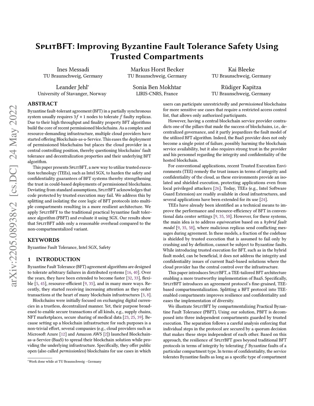 Byzantine fault-tolerant agreement (BFT) in a partially synchronous system usually requires 3f + 1 nodes to tolerate f faulty replicas. Due to their high throughput and finality property BFT algorithms build the core of recent permissioned blockchains. As a complex and resource-demanding infrastructure, multiple cloud providers have started offering Blockchain-as-a-Service. This eases the deployment of permissioned blockchains but places the cloud provider in a central controlling position, thereby questioning blockchains' fault tolerance and decentralization properties and their underlying BFT algorithm. This paper presents SplitBFT, a new way to utilize trusted execution technology (TEEs), such as Intel SGX, to harden the safety and confidentiality guarantees of BFT systems thereby strengthening the trust in could-based deployments of permissioned blockchains. Deviating from standard assumptions, SplitBFT acknowledges that code protected by trusted execution may fail. We address this by splitting and isolating the core logic of BFT protocols into multiple compartments resulting in a more resilient architecture. We apply SplitBFT to the traditional practical byzantine fault tolerance algorithm (PBFT) and evaluate it using SGX. Our results show that SplitBFT adds only a reasonable overhead compared to the non-compartmentalized variant.