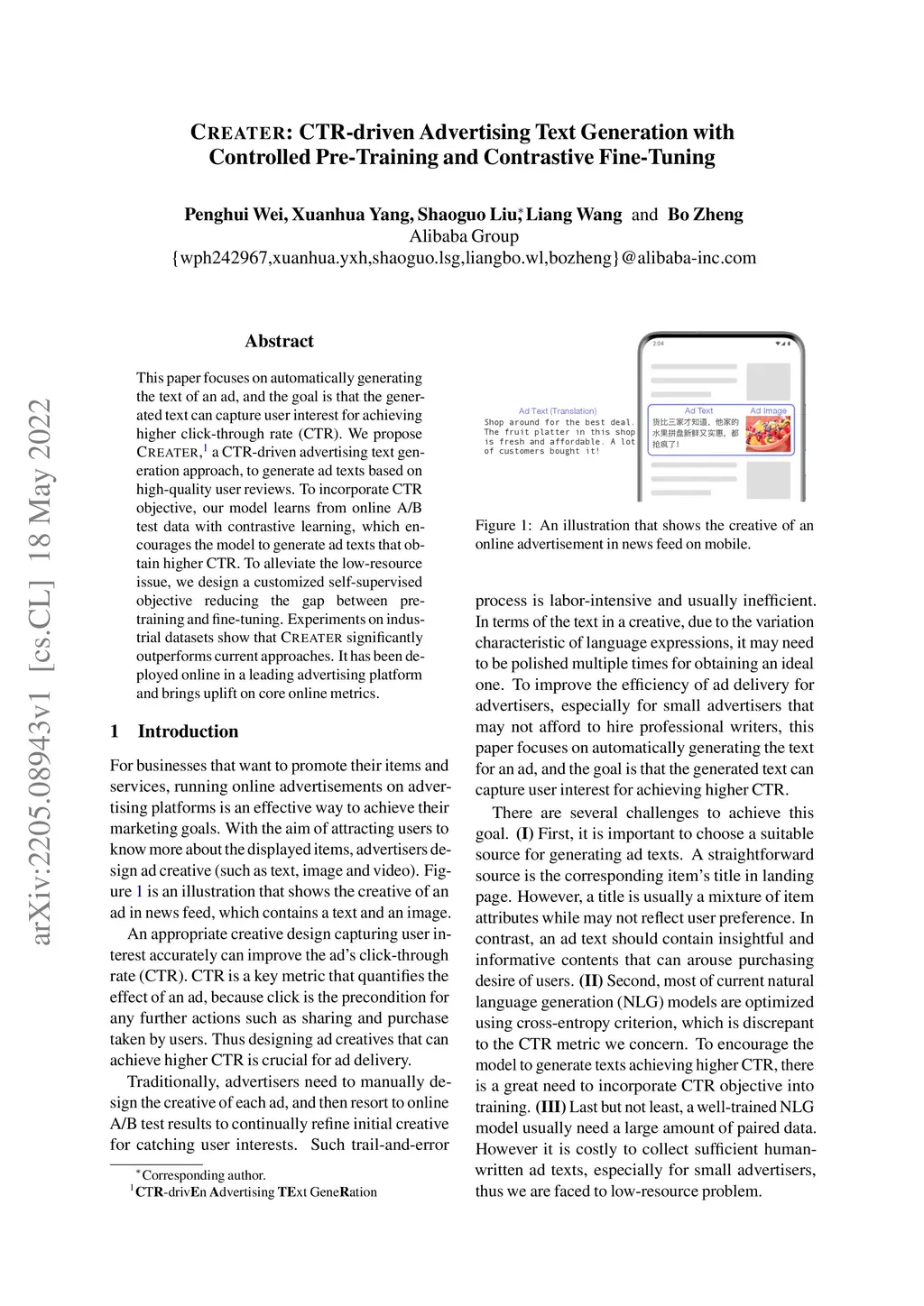 This paper focuses on automatically generating the text of an ad, and the goal is that the generated text can capture user interest for achieving higher click-through rate (CTR). We propose CREATER, a CTR-driven advertising text generation approach, to generate ad texts based on high-quality user reviews. To incorporate CTR objective, our model learns from online A/B test data with contrastive learning, which encourages the model to generate ad texts that obtain higher CTR. To alleviate the low-resource issue, we design a customized self-supervised objective reducing the gap between pre-training and fine-tuning. Experiments on industrial datasets show that CREATER significantly outperforms current approaches. It has been deployed online in a leading advertising platform and brings uplift on core online metrics.