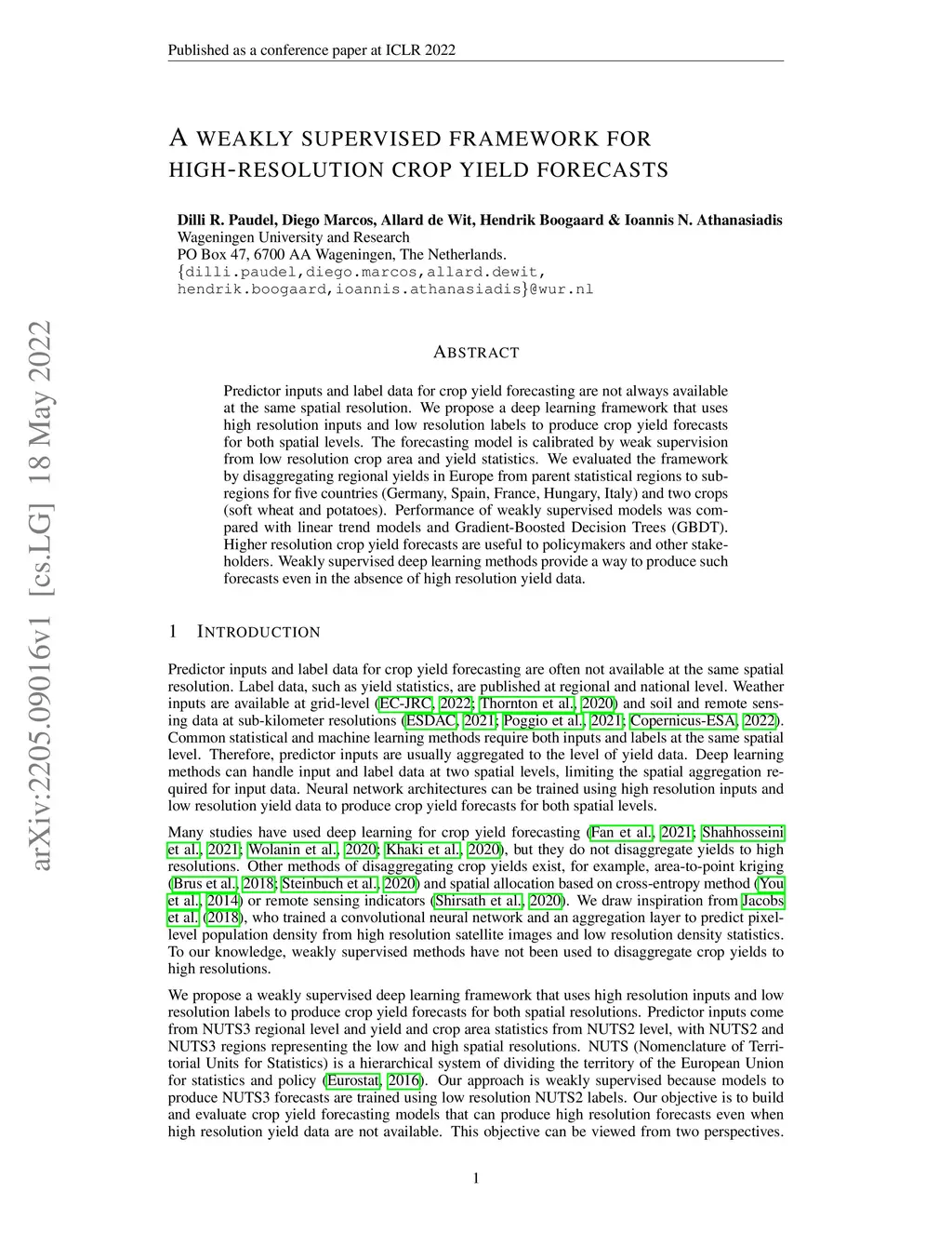 Predictor inputs and label data for crop yield forecasting are not always available at the same spatial resolution. We propose a deep learning framework that uses high resolution inputs and low resolution labels to produce crop yield forecasts for both spatial levels. The forecasting model is calibrated by weak supervision from low resolution crop area and yield statistics. We evaluated the framework by disaggregating regional yields in Europe from parent statistical regions to sub-regions for five countries (Germany, Spain, France, Hungary, Italy) and two crops (soft wheat and potatoes). Performance of weakly supervised models was compared with linear trend models and Gradient-Boosted Decision Trees (GBDT). Higher resolution crop yield forecasts are useful to policymakers and other stakeholders. Weakly supervised deep learning methods provide a way to produce such forecasts even in the absence of high resolution yield data.
