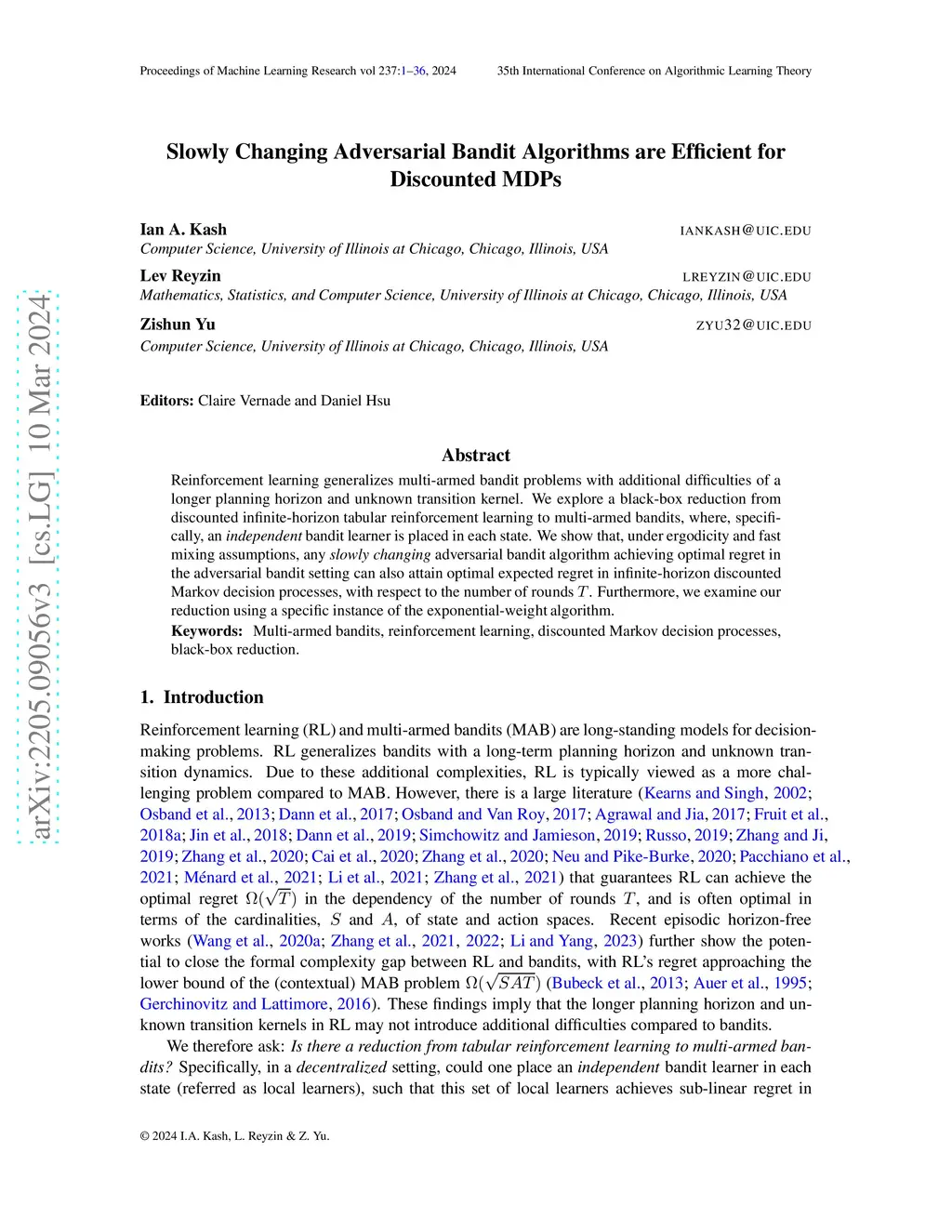 Reinforcement learning generalizes multi-armed bandit problems with additional difficulties of a longer planning horizon and unknown transition kernel. We explore a black-box reduction from discounted infinite-horizon tabular reinforcement learning to multi-armed bandits, where, specifically, an independent bandit learner is placed in each state. We show that, under ergodicity and fast mixing assumptions, any slowly changing adversarial bandit algorithm achieving optimal regret in the adversarial bandit setting can also attain optimal expected regret in infinite-horizon discounted Markov decision processes, with respect to the number of rounds . Furthermore, we examine our reduction using a specific instance of the exponential-weight algorithm.
