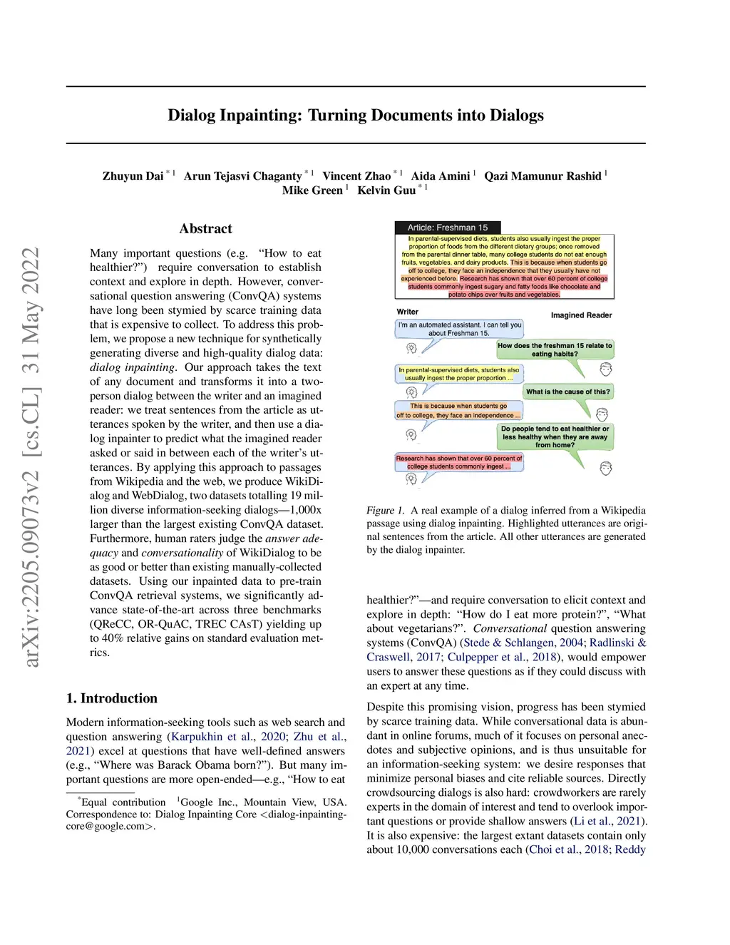 Many important questions (e.g. "How to eat healthier?") require conversation to establish context and explore in depth. However, conversational question answering (ConvQA) systems have long been stymied by scarce training data that is expensive to collect. To address this problem, we propose a new technique for synthetically generating diverse and high-quality dialog data: dialog inpainting. Our approach takes the text of any document and transforms it into a two-person dialog between the writer and an imagined reader: we treat sentences from the article as utterances spoken by the writer, and then use a dialog inpainter to predict what the imagined reader asked or said in between each of the writer's utterances. By applying this approach to passages from Wikipedia and the web, we produce WikiDialog and WebDialog, two datasets totalling 19 million diverse information-seeking dialogs -- 1,000x larger than the largest existing ConvQA dataset. Furthermore, human raters judge the answer adequacy and conversationality of WikiDialog to be as good or better than existing manually-collected datasets. Using our inpainted data to pre-train ConvQA retrieval systems, we significantly advance state-of-the-art across three benchmarks (QReCC, OR-QuAC, TREC CAsT) yielding up to 40% relative gains on standard evaluation metrics.