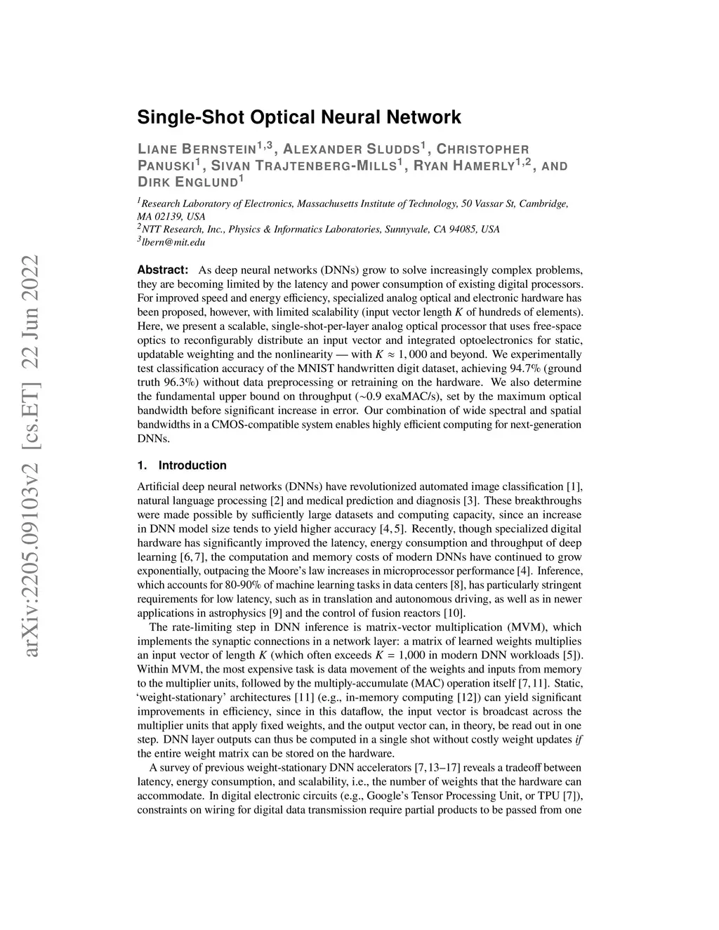 As deep neural networks (DNNs) grow to solve increasingly complex problems, they are becoming limited by the latency and power consumption of existing digital processors. For improved speed and energy efficiency, specialized analog optical and electronic hardware has been proposed, however, with limited scalability (input vector length of hundreds of elements). Here, we present a scalable, single-shot-per-layer analog optical processor that uses free-space optics to reconfigurably distribute an input vector and integrated optoelectronics for static, updatable weighting and the nonlinearity -- with and beyond. We experimentally test classification accuracy of the MNIST handwritten digit dataset, achieving 94.7% (ground truth 96.3%) without data preprocessing or retraining on the hardware. We also determine the fundamental upper bound on throughput (0.9 exaMAC/s), set by the maximum optical bandwidth before significant increase in error. Our combination of wide spectral and spatial bandwidths in a CMOS-compatible system enables highly efficient computing for next-generation DNNs.