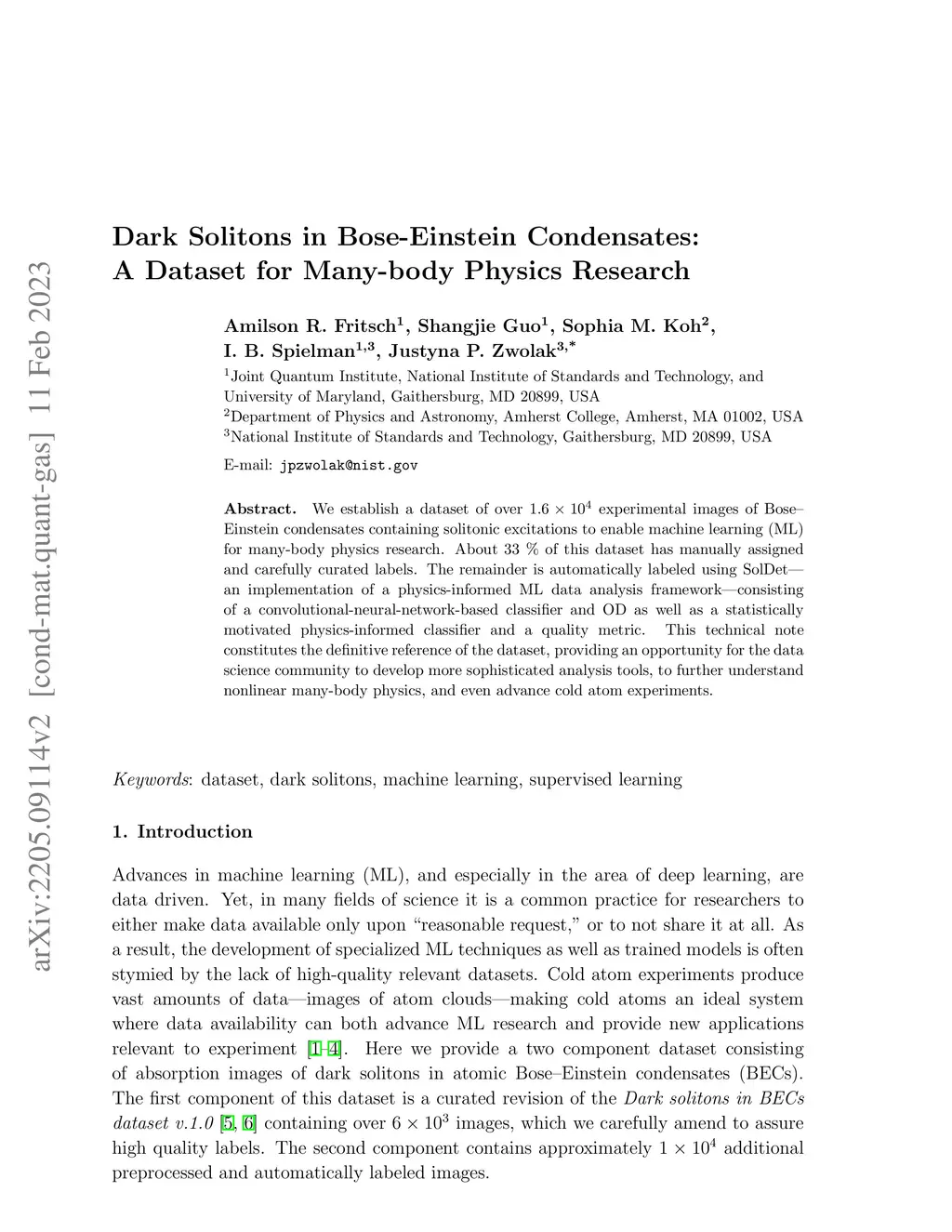 We establish a dataset of over experimental images of Bose--Einstein condensates containing solitonic excitations to enable machine learning (ML) for many-body physics research. About of this dataset has manually assigned and carefully curated labels. The remainder is automatically labeled using SolDet -- an implementation of a physics-informed ML data analysis framework -- consisting of a convolutional-neural-network-based classifier and OD as well as a statistically motivated physics-informed classifier and a quality metric. This technical note constitutes the definitive reference of the dataset, providing an opportunity for the data science community to develop more sophisticated analysis tools, to further understand nonlinear many-body physics, and even advance cold atom experiments.