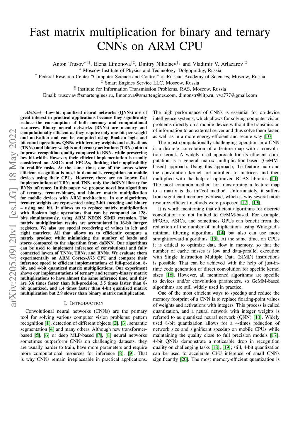 Fast matrix multiplication for binary and ternary CNNs on ARM CPU
