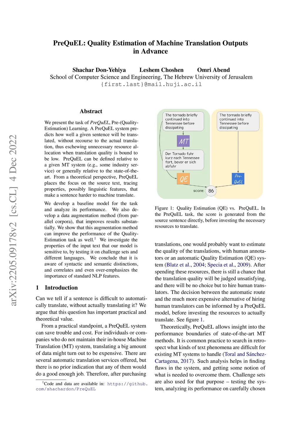 We present the task of PreQuEL, Pre-(Quality-Estimation) Learning. A PreQuEL system predicts how well a given sentence will be translated, without recourse to the actual translation, thus eschewing unnecessary resource allocation when translation quality is bound to be low. PreQuEL can be defined relative to a given MT system (e.g., some industry service) or generally relative to the state-of-the-art. From a theoretical perspective, PreQuEL places the focus on the source text, tracing properties, possibly linguistic features, that make a sentence harder to machine translate. We develop a baseline model for the task and analyze its performance. We also develop a data augmentation method (from parallel corpora), that improves results substantially. We show that this augmentation method can improve the performance of the Quality-Estimation task as well. We investigate the properties of the input text that our model is sensitive to, by testing it on challenge sets and different languages. We conclude that it is aware of syntactic and semantic distinctions, and correlates and even over-emphasizes the importance of standard NLP features.