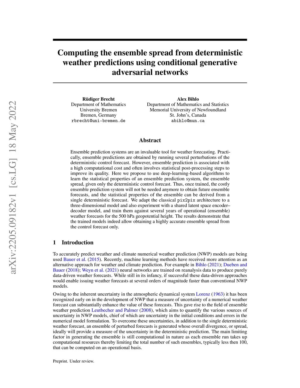 Ensemble prediction systems are an invaluable tool for weather forecasting. Practically, ensemble predictions are obtained by running several perturbations of the deterministic control forecast. However, ensemble prediction is associated with a high computational cost and often involves statistical post-processing steps to improve its quality. Here we propose to use deep-learning-based algorithms to learn the statistical properties of an ensemble prediction system, the ensemble spread, given only the deterministic control forecast. Thus, once trained, the costly ensemble prediction system will not be needed anymore to obtain future ensemble forecasts, and the statistical properties of the ensemble can be derived from a single deterministic forecast. We adapt the classical pix2pix architecture to a three-dimensional model and also experiment with a shared latent space encoder-decoder model, and train them against several years of operational (ensemble) weather forecasts for the 500 hPa geopotential height. The results demonstrate that the trained models indeed allow obtaining a highly accurate ensemble spread from the control forecast only.