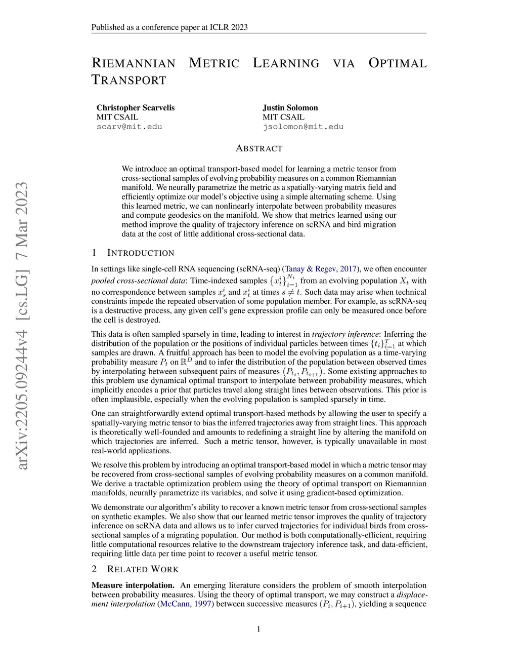 We introduce an optimal transport-based model for learning a metric tensor from cross-sectional samples of evolving probability measures on a common Riemannian manifold. We neurally parametrize the metric as a spatially-varying matrix field and efficiently optimize our model's objective using a simple alternating scheme. Using this learned metric, we can nonlinearly interpolate between probability measures and compute geodesics on the manifold. We show that metrics learned using our method improve the quality of trajectory inference on scRNA and bird migration data at the cost of little additional cross-sectional data.