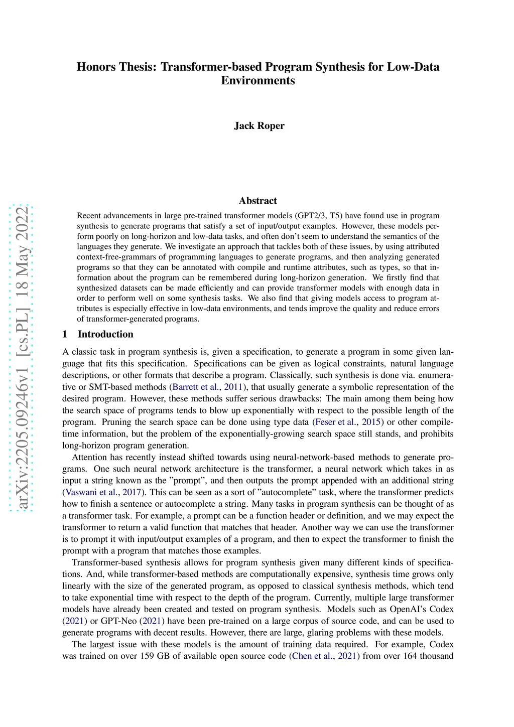 Recent advancements in large pre-trained transformer models (GPT2/3, T5) have found use in program synthesis to generate programs that satisfy a set of input/output examples. However, these models perform poorly on long-horizon and low-data tasks, and often don't seem to understand the semantics of the languages they generate. We investigate an approach that tackles both of these issues, by using attributed context-free-grammars of programming languages to generate programs, and then analyzing generated programs so that they can be annotated with compile and runtime attributes, such as types, so that information about the program can be remembered during long-horizon generation. We firstly find that synthesized datasets can be made efficiently and can provide transformer models with enough data in order to perform well on some synthesis tasks. We also find that giving models access to program attributes is especially effective in low-data environments, and tends improve the quality and reduce errors of transformer-generated programs.