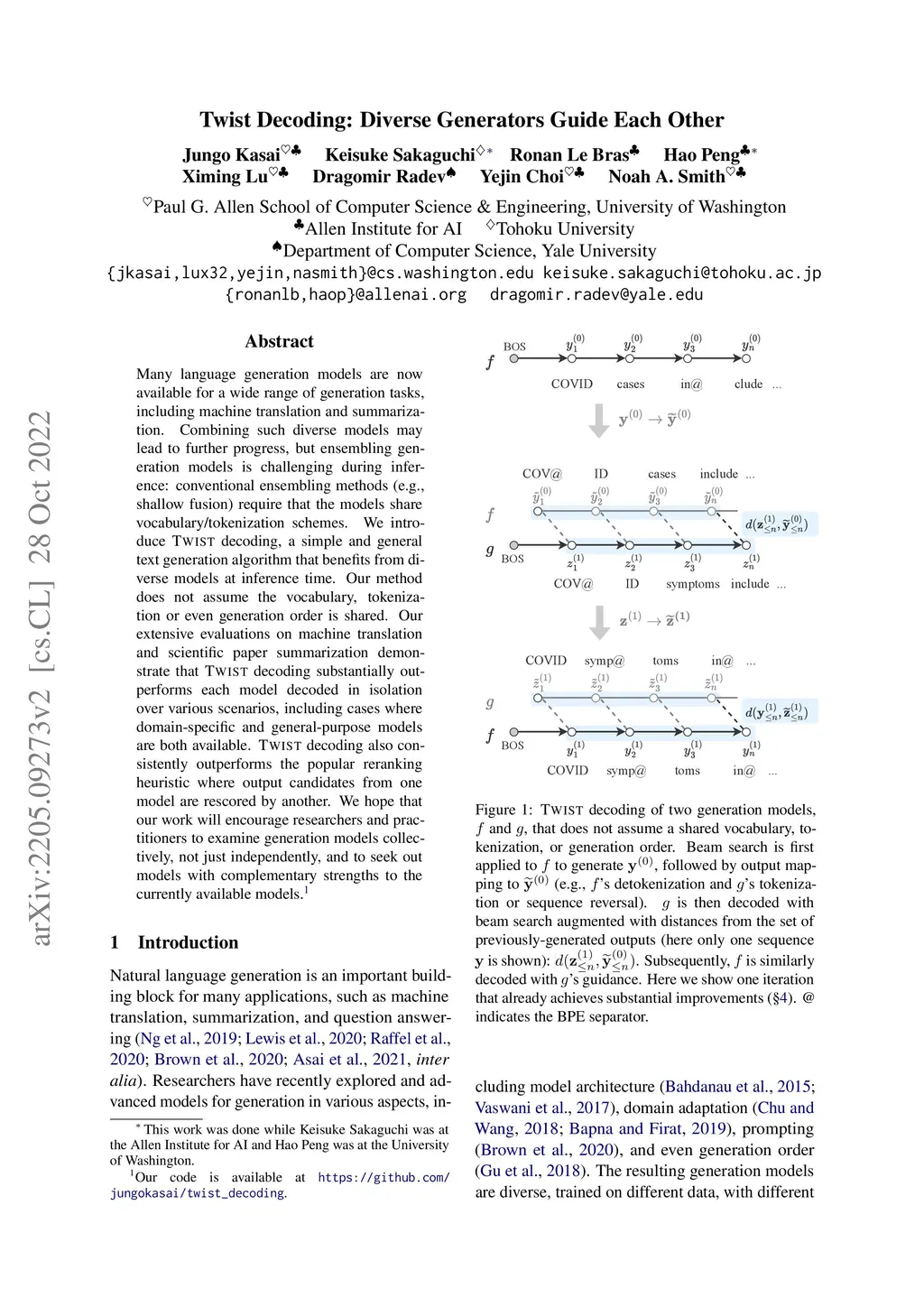 Many language generation models are now available for a wide range of generation tasks, including machine translation and summarization. Combining such diverse models may lead to further progress, but ensembling generation models is challenging during inference: conventional ensembling methods (e.g., shallow fusion) require that the models share vocabulary/tokenization schemes. We introduce Twist decoding, a simple and general text generation algorithm that benefits from diverse models at inference time. Our method does not assume the vocabulary, tokenization or even generation order is shared. Our extensive evaluations on machine translation and scientific paper summarization demonstrate that Twist decoding substantially outperforms each model decoded in isolation over various scenarios, including cases where domain-specific and general-purpose models are both available. Twist decoding also consistently outperforms the popular reranking heuristic where output candidates from one model are rescored by another. We hope that our work will encourage researchers and practitioners to examine generation models collectively, not just independently, and to seek out models with complementary strengths to the currently available models. Our code is available at https://github.com/jungokasai/twist_decoding.