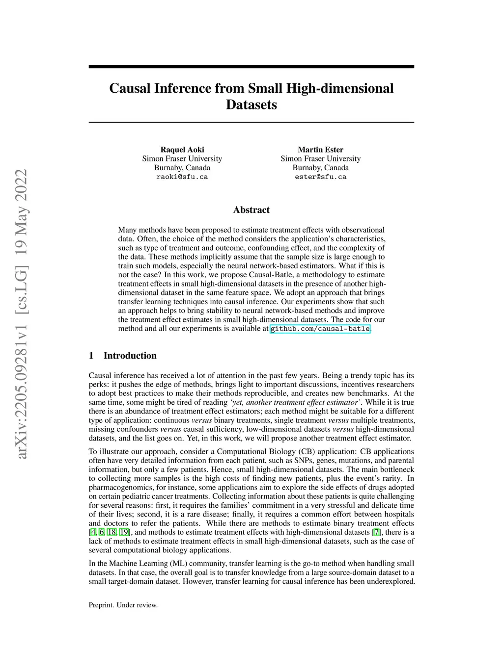 Many methods have been proposed to estimate treatment effects with observational data. Often, the choice of the method considers the application's characteristics, such as type of treatment and outcome, confounding effect, and the complexity of the data. These methods implicitly assume that the sample size is large enough to train such models, especially the neural network-based estimators. What if this is not the case? In this work, we propose Causal-Batle, a methodology to estimate treatment effects in small high-dimensional datasets in the presence of another high-dimensional dataset in the same feature space. We adopt an approach that brings transfer learning techniques into causal inference. Our experiments show that such an approach helps to bring stability to neural network-based methods and improve the treatment effect estimates in small high-dimensional datasets.