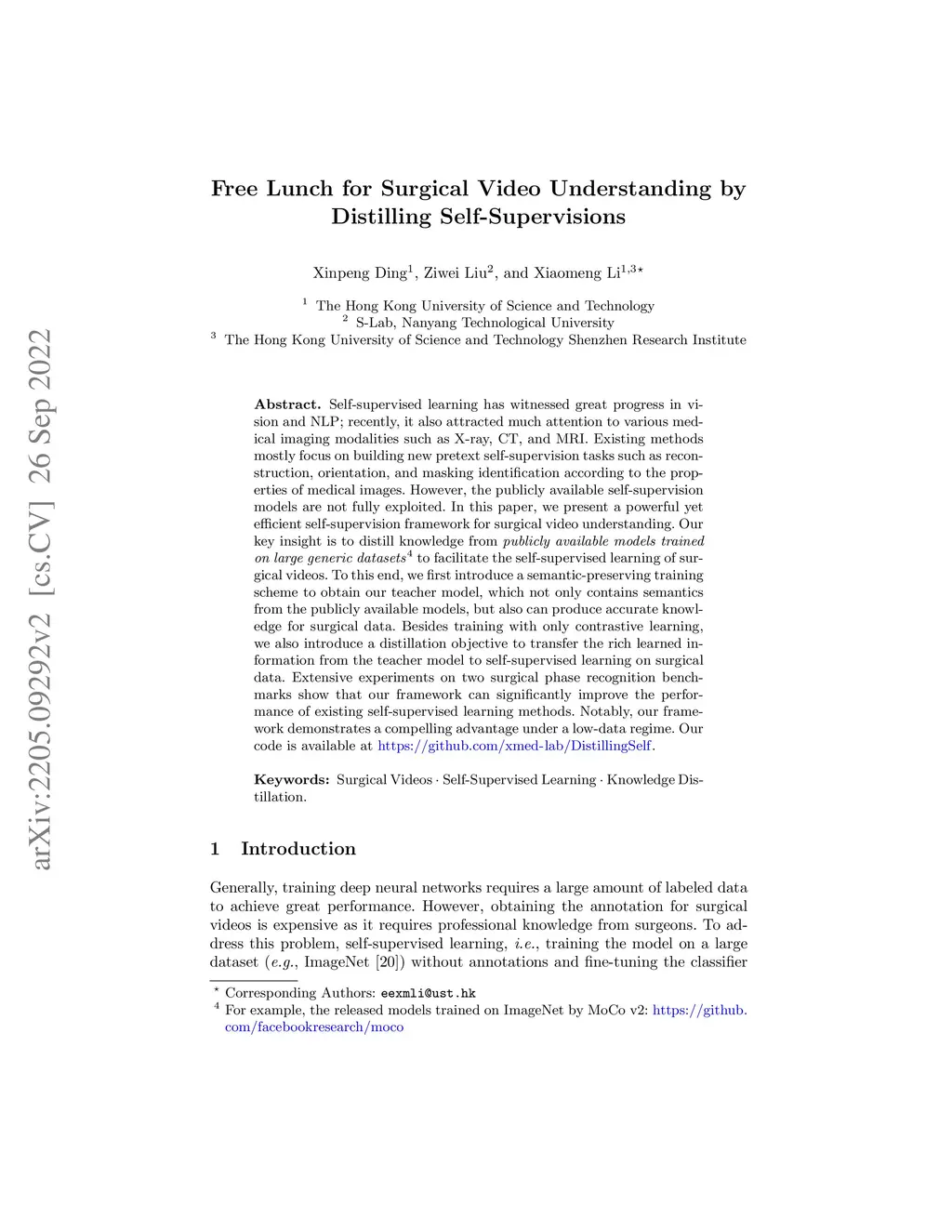 Self-supervised learning has witnessed great progress in vision and NLP; recently, it also attracted much attention to various medical imaging modalities such as X-ray, CT, and MRI. Existing methods mostly focus on building new pretext self-supervision tasks such as reconstruction, orientation, and masking identification according to the properties of medical images. However, the publicly available self-supervision models are not fully exploited. In this paper, we present a powerful yet efficient self-supervision framework for surgical video understanding. Our key insight is to distill knowledge from publicly available models trained on large generic datasets4 to facilitate the self-supervised learning of surgical videos. To this end, we first introduce a semantic-preserving training scheme to obtain our teacher model, which not only contains semantics from the publicly available models, but also can produce accurate knowledge for surgical data. Besides training with only contrastive learning, we also introduce a distillation objective to transfer the rich learned information from the teacher model to self-supervised learning on surgical data. Extensive experiments on two surgical phase recognition benchmarks show that our framework can significantly improve the performance of existing self-supervised learning methods. Notably, our framework demonstrates a compelling advantage under a low-data regime. Our code is available at https://github.com/xmed-lab/DistillingSelf.
